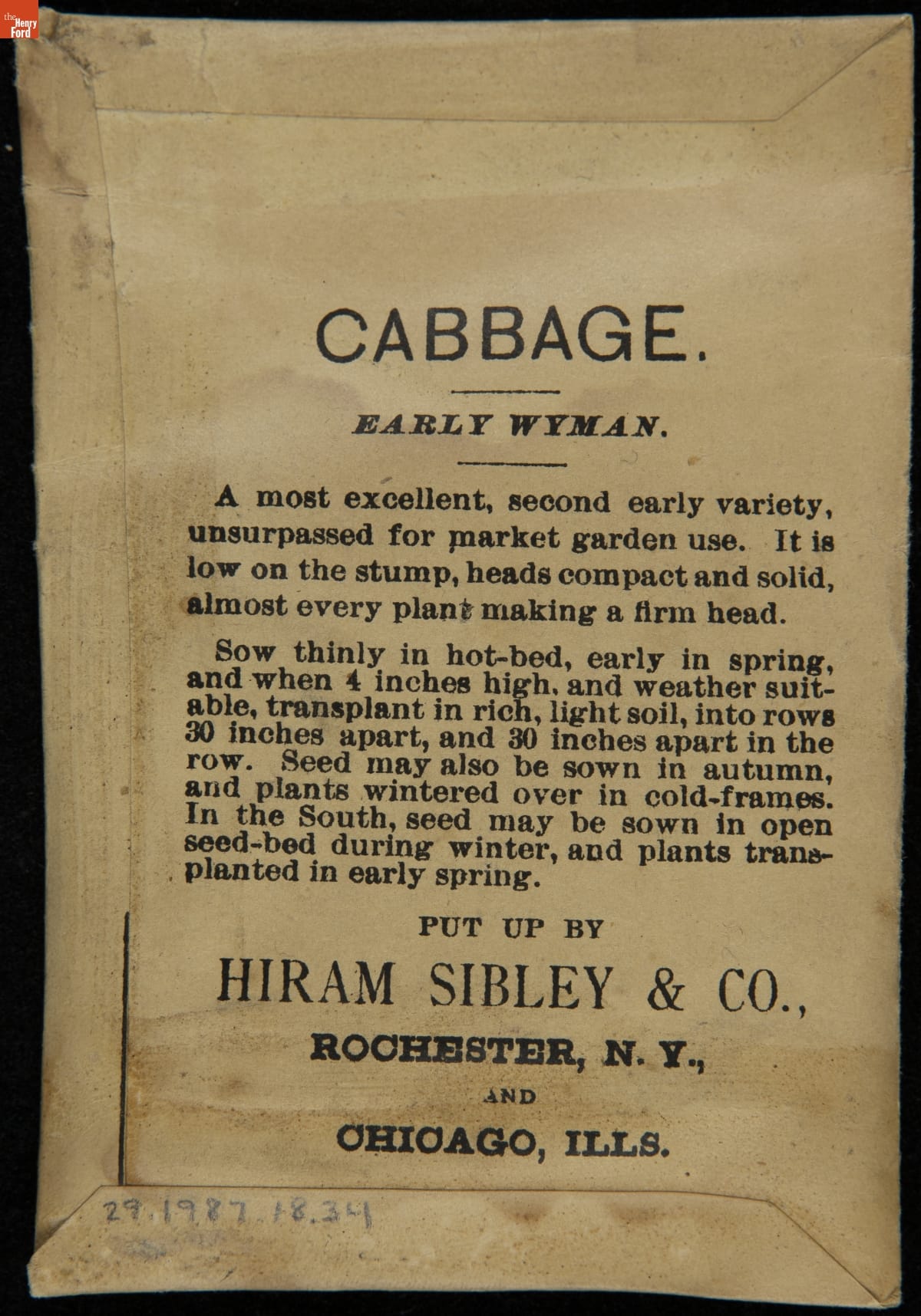 on front: CABBAGE / EARLY WYMAN / SEND FOR OUR ILLUSTRATED CATALOGUE... / HIRAM SIBLEY & CO. / ROCHESTER, N.Y. & CHICAGO, ILL.