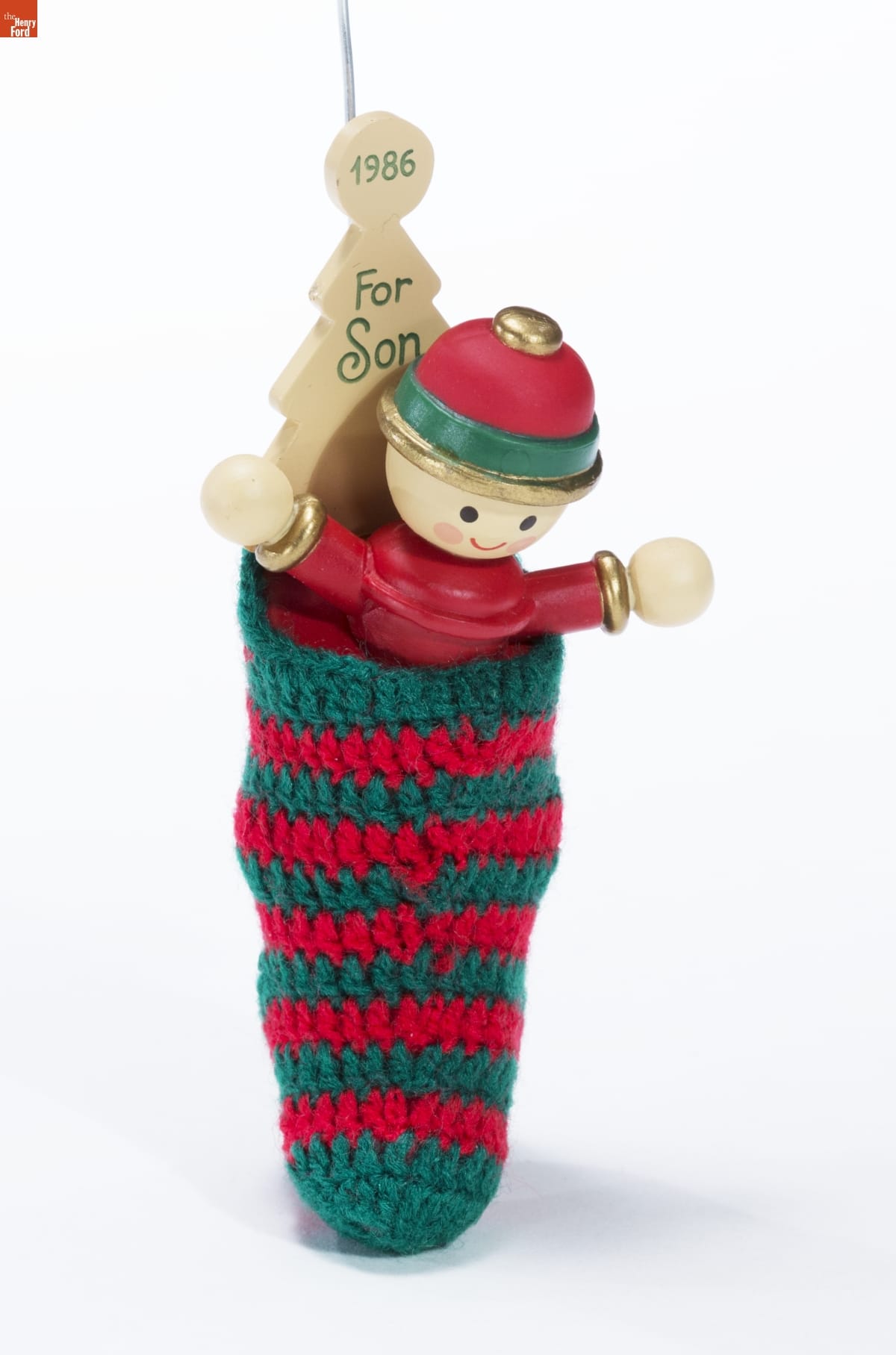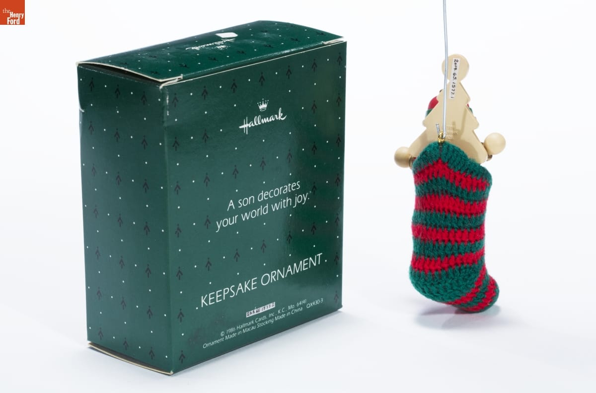 Hallmark / A son decorates / your world with joy. / KEEPSAKE ORNAMENT / (C) 1986 Hallmark Cards, Inc., K.C., Mo. 64141 / Ornament Made in Macau Stocking Made in China QX430-3