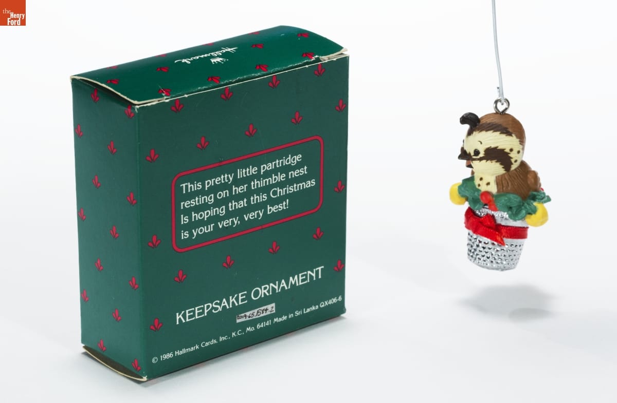 This pretty little partridge / resting on her thimble nest / is hoping that this Christmas / is your very, very best! / KEEPSAKE ORNAMENT / (C) 1986 Hallmark Cards, Inc., K.C., Mo 64141 Made in Sri Lanka. QX406-6