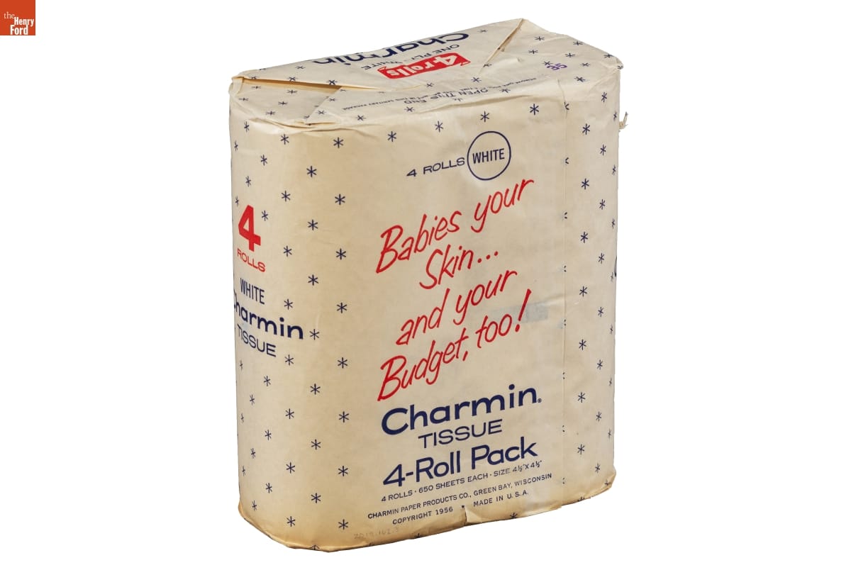 4 ROLLS WHITE / Babies your Skin... / and your Budget, too! / Charmin / TISSUE / 4-Roll Pack / 4 ROLLS 650 SHEETS EACH SIZE 4 1/2" X 4 1/2" / CHARMIN PAPER PRODUCTS CO., GREEN BAY, WISCONSIN / COPYRIGHT 1956 MADE IN U.S.A.