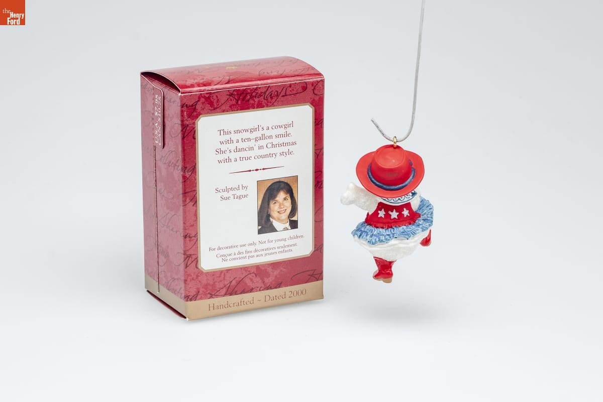 This snowgirl's a cowgirl / with a ten-gallon smile / She's dancin' in Christmas / with a true country style. / Sculpted by / Sue Tague / For decorative use only. Not for young children. / Concue a des fins decoratives seulement. / Ne convient pas aux jeunes enfants. / Handcrafted - Dated 2000