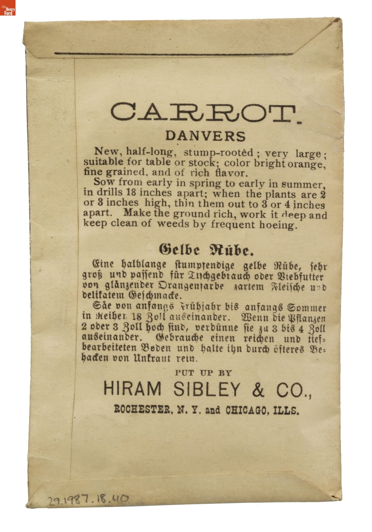Distributing seeds required sealing them into little packets or "papers" constructed like envelopes. Seed companies advertised their businesses on these packets, illustrated the vegetable with hand-colored images, and specified growing directions, sometimes in multiple languages. Hiram Sibley and Co. packaged collections of vegetable seeds in specially designed boxes and shipped them to general stores for sale to home gardeners.