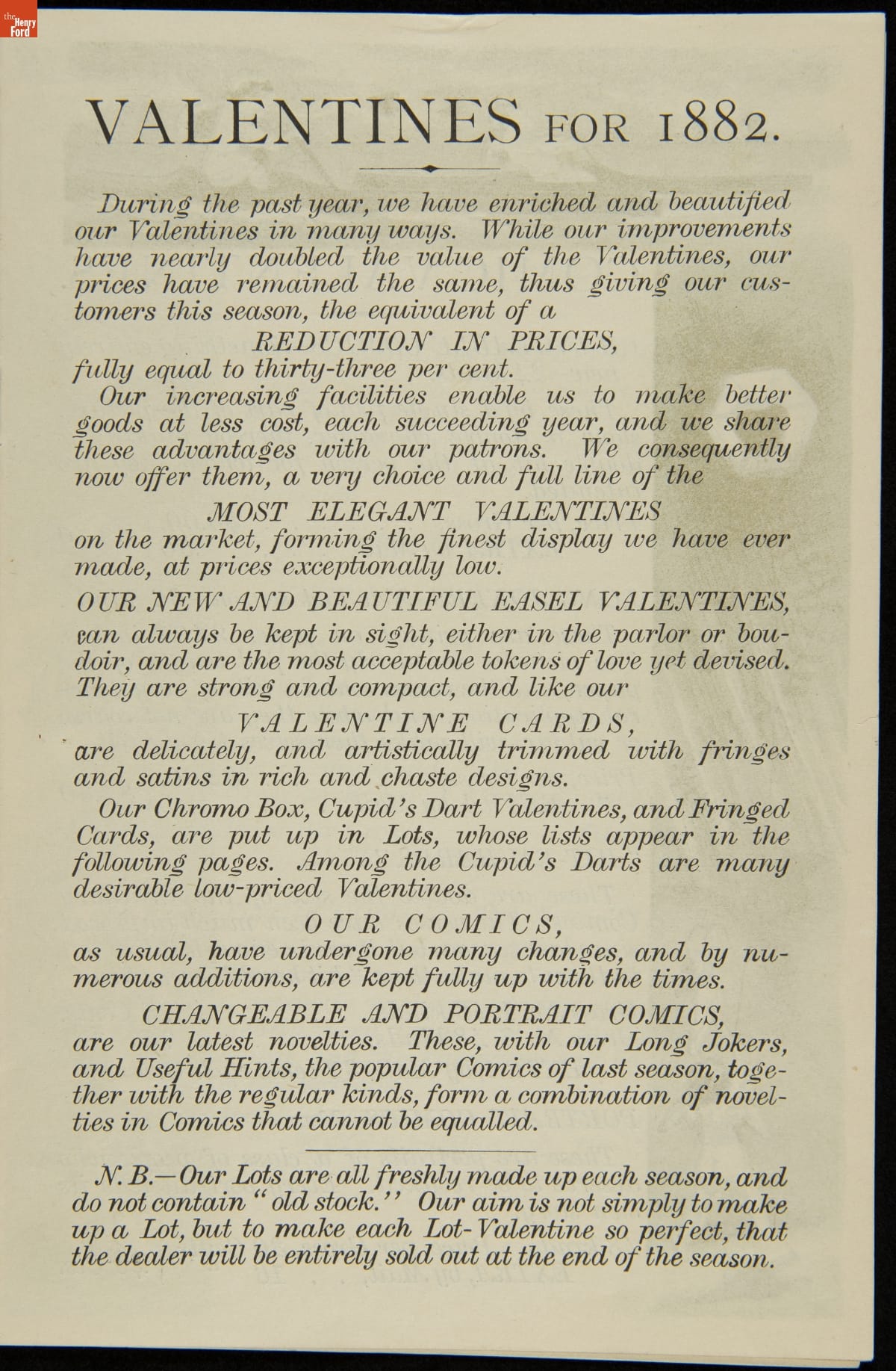 Throughout the second half of the nineteenth century, family members and sweethearts commonly exchanged Valentine's Day greetings. Typical valentines were frilly and often depicted cherubs, birds, or flower garlands. This eye-catching catalog lists a range of valentines offered by the McLoughlin Bros. publishing firm for 1882.
