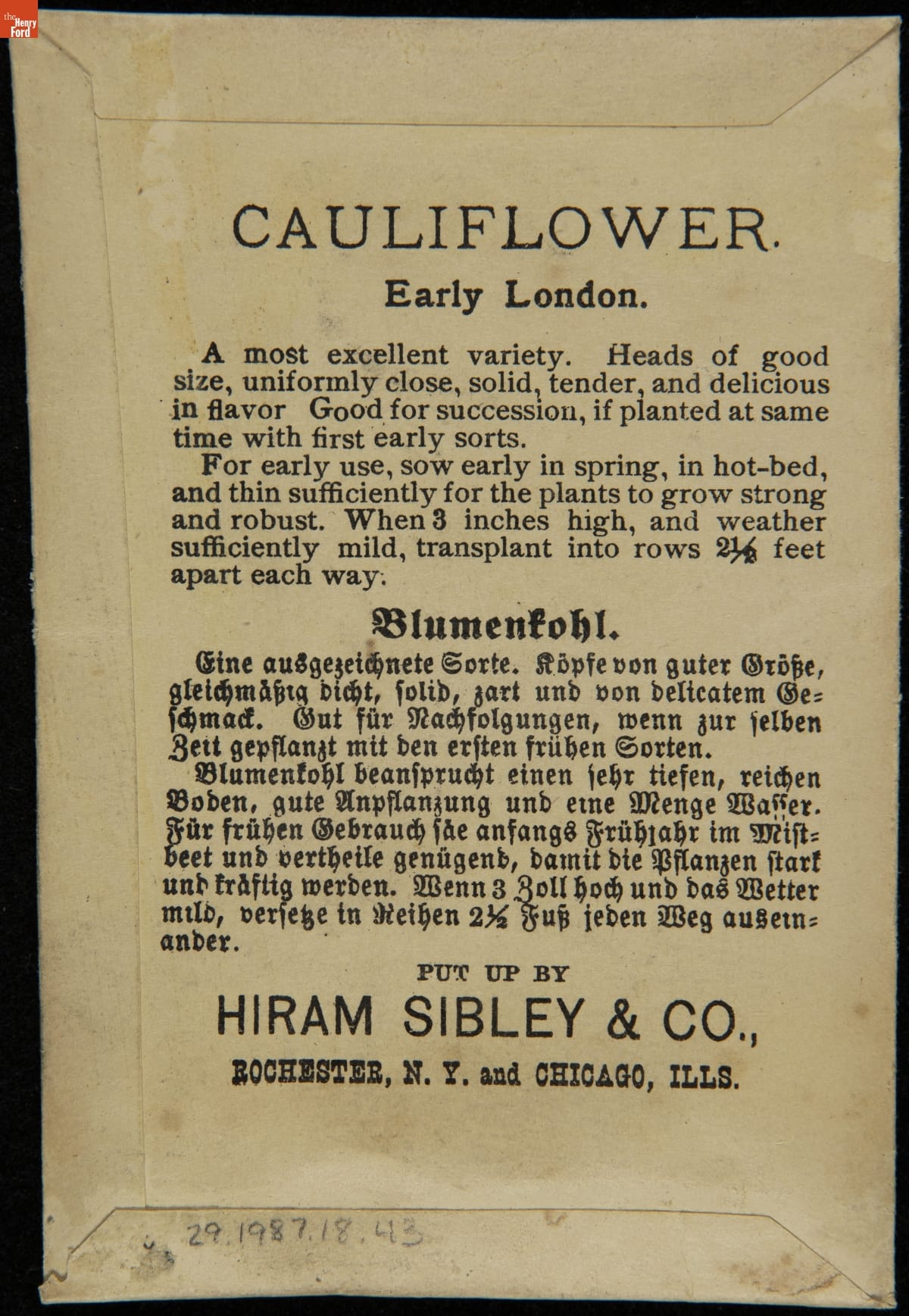 on front: CAULIFLOWER / EARLY LONDON / SEND FOR OUR ILLUSTRATED CATALOGUE... / HIRAM SIBLEY & CO. / ROCHESTER, N.Y. & CHICAGO, ILL.