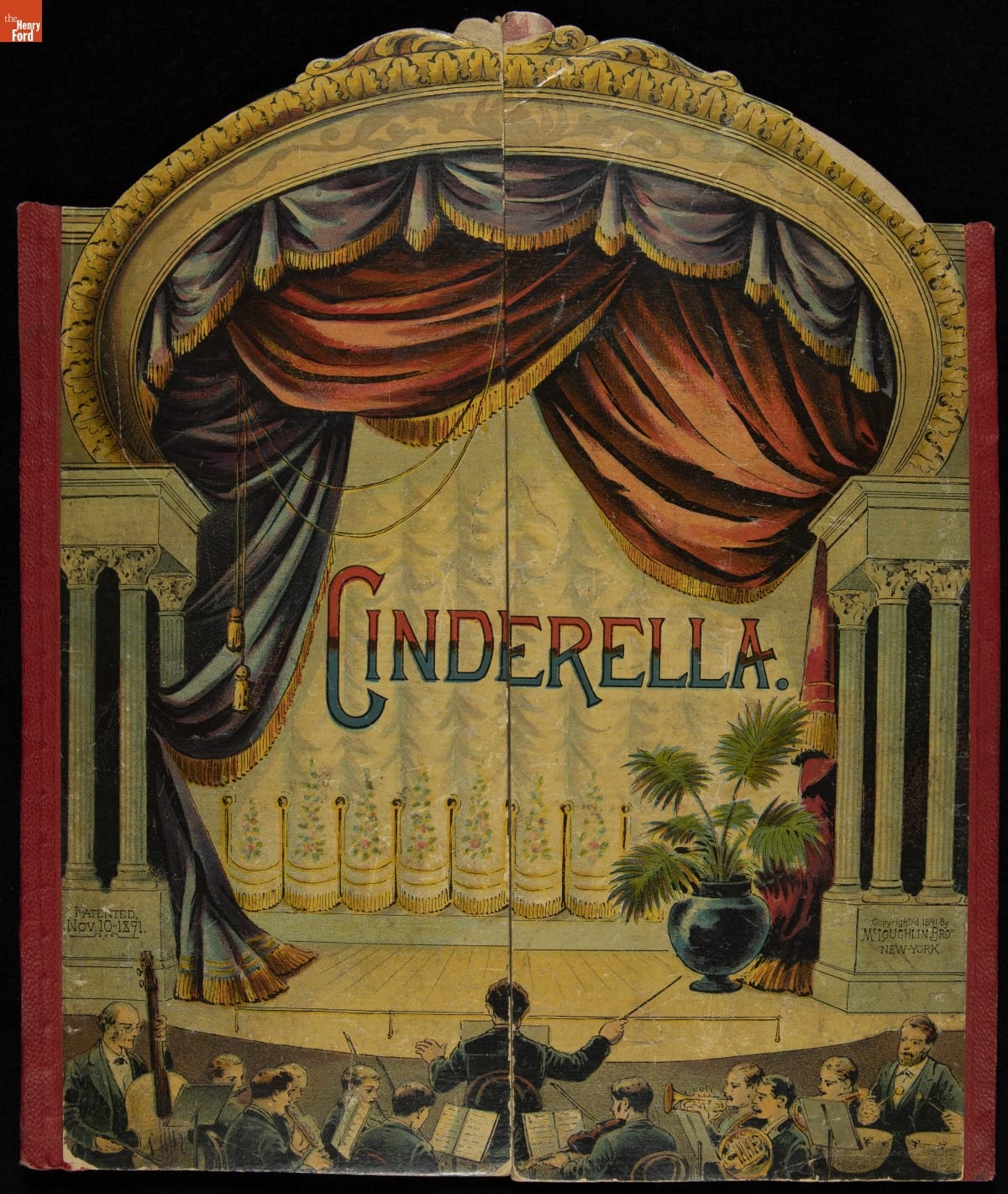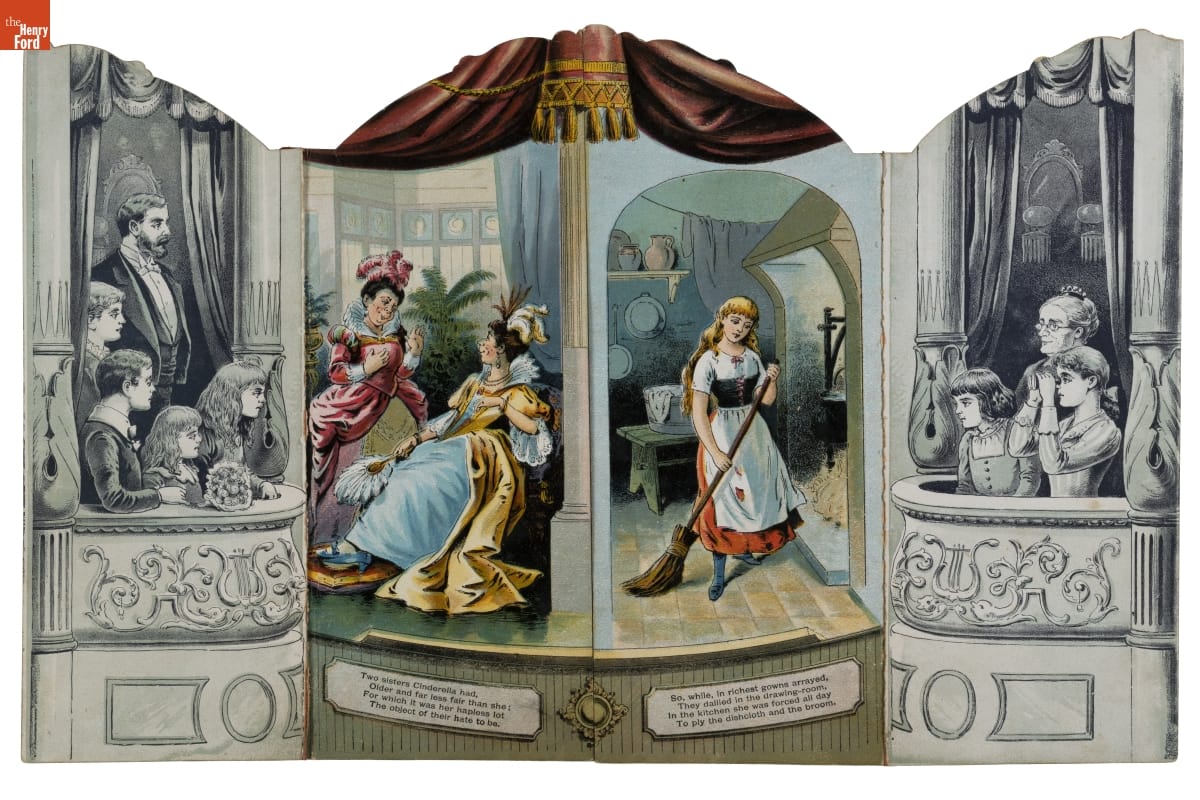In 1891, the McLoughlin Bros. publishing firm patented this arch-shaped variant of the rectangular "pantomime" books available at the time. Pantomime books depicted a theater during a live stage show. Readers turned the pages to reveal each new scene as a family of theatergoers -- printed behind the cover flaps -- watched the "play" unfold.