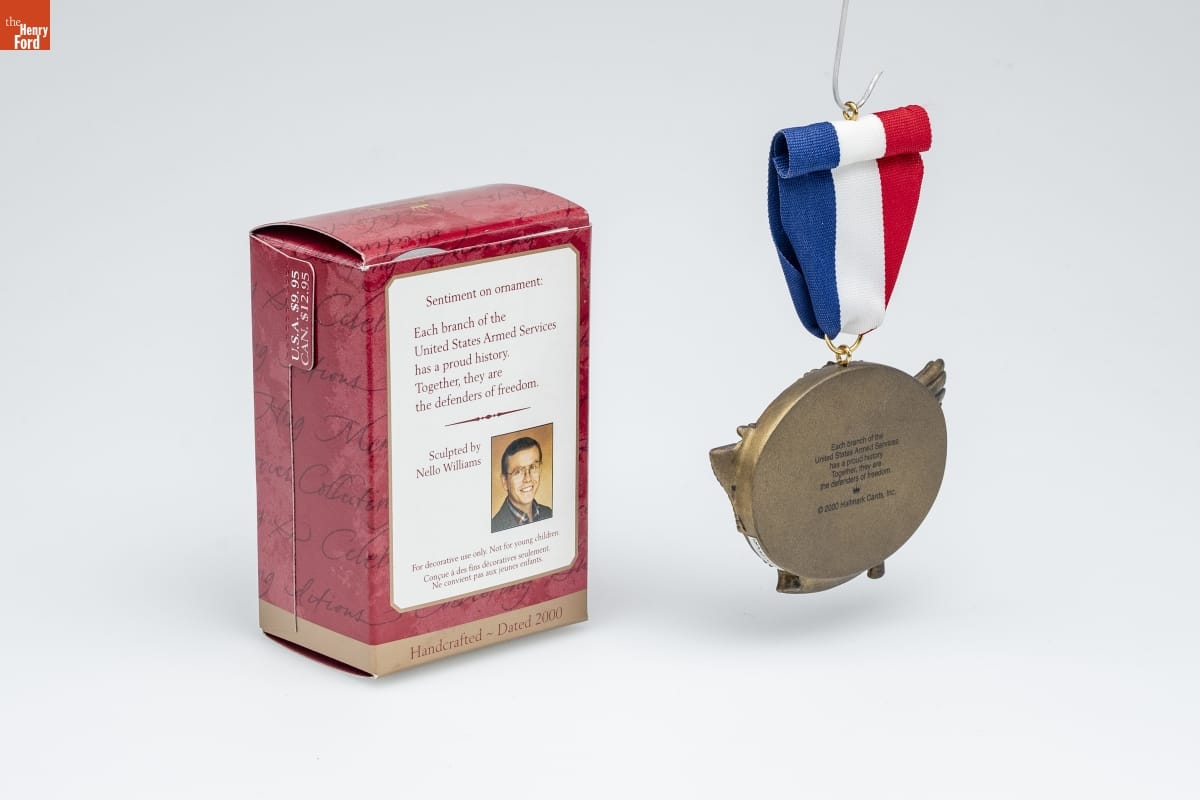 Sentiment on ornament: / Each branch of the / United States Armed Services / has a proud history. / Together, they are / the defenders of freedom. / Sculpted by / Nello Williams / For decorative use only. Not for young children. / Concue a des fins decoratives seulement. / Ne convient pas aux jeunes enfants. / Handcrafted - Dated 2000