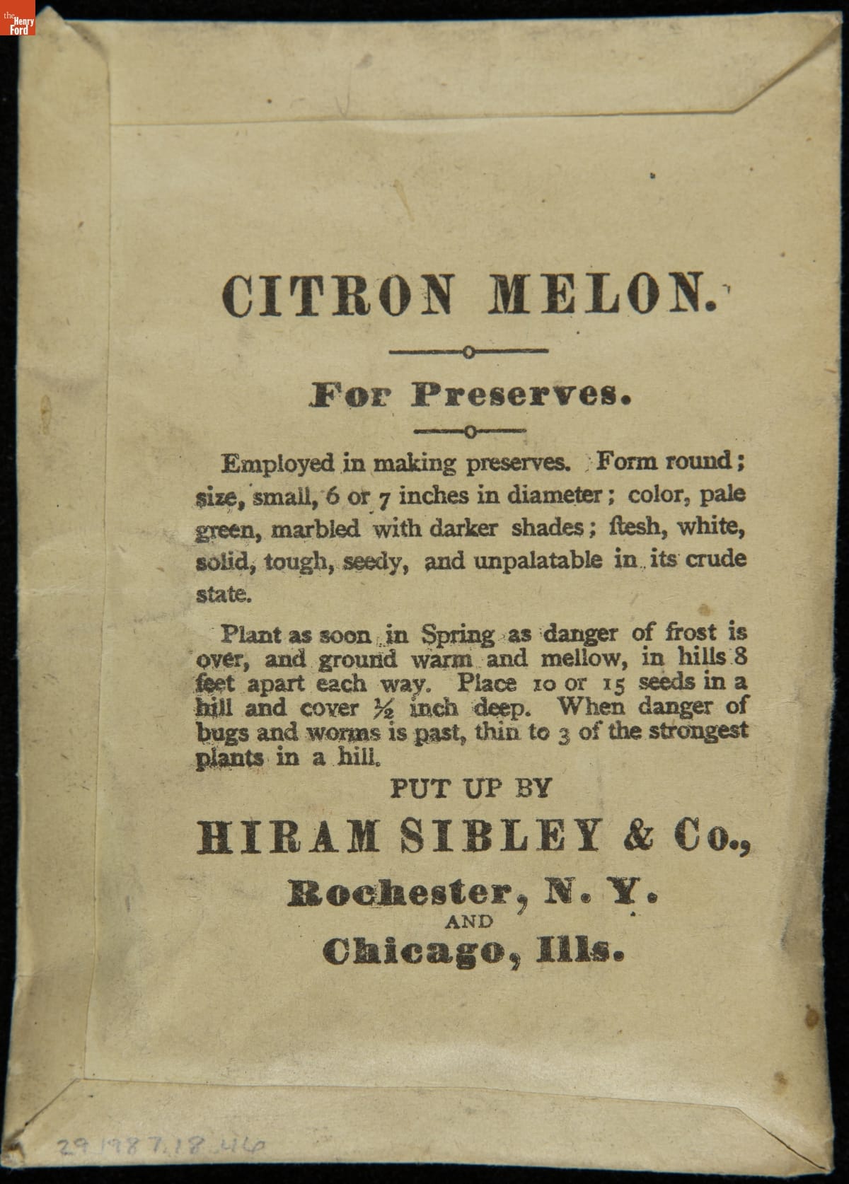 on front: CITRON MELON / FOR PRESERVES / SEND FOR OUR ILLUSTRATED CATALOGUE... / HIRAM SIBLEY & CO. / ROCHESTER, N.Y. & CHICAGO, ILL.