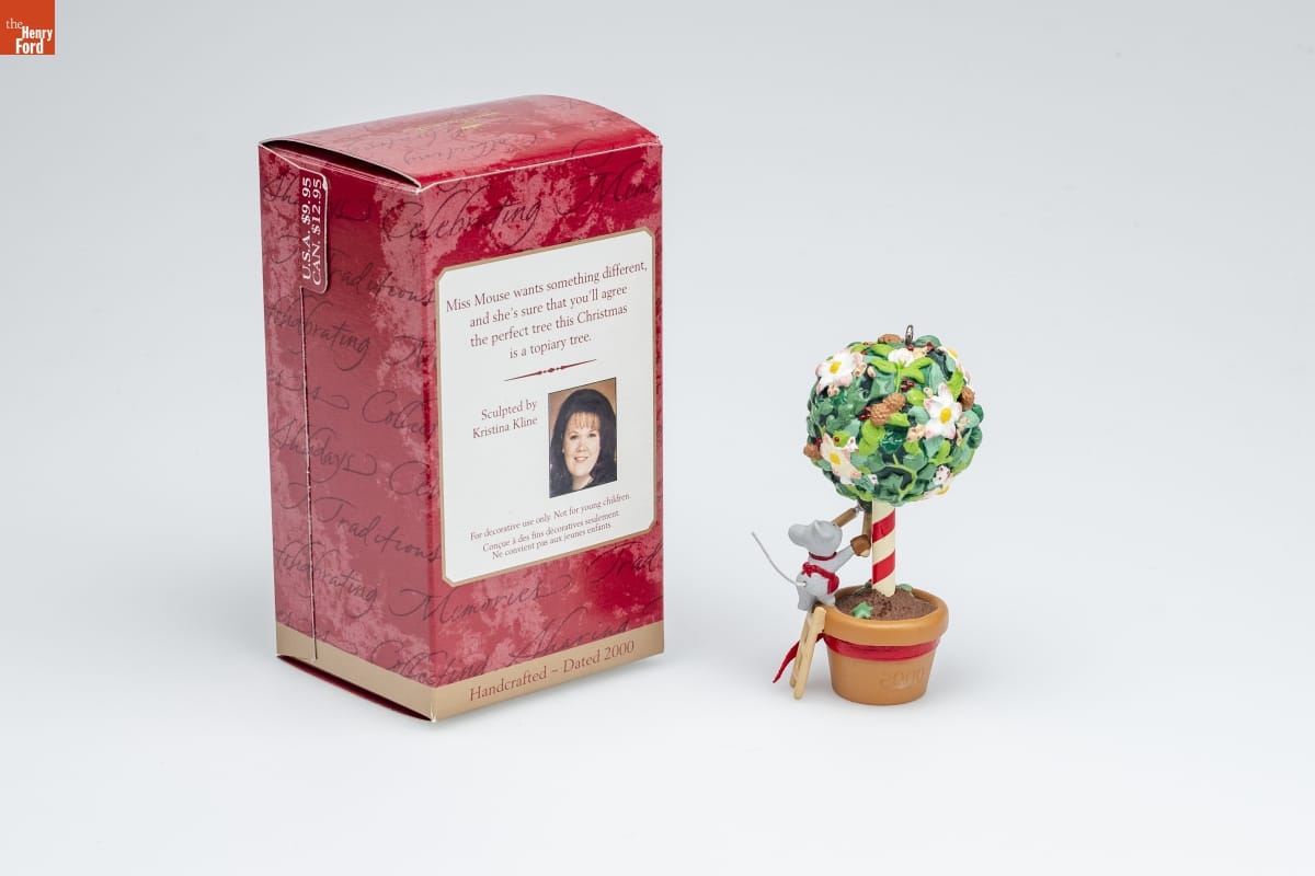 Miss Mouse wants something different, / and she's sure that you'll agree / the perfect tree this Christmas / is a topiary tree. / Sculpted by / Kristina Kline / For decorative use only. Not for young children. / Concue a des fins decoratives seulement. / Ne convient pas aux jeunes enfants. / Handcrafted - Dated 2000