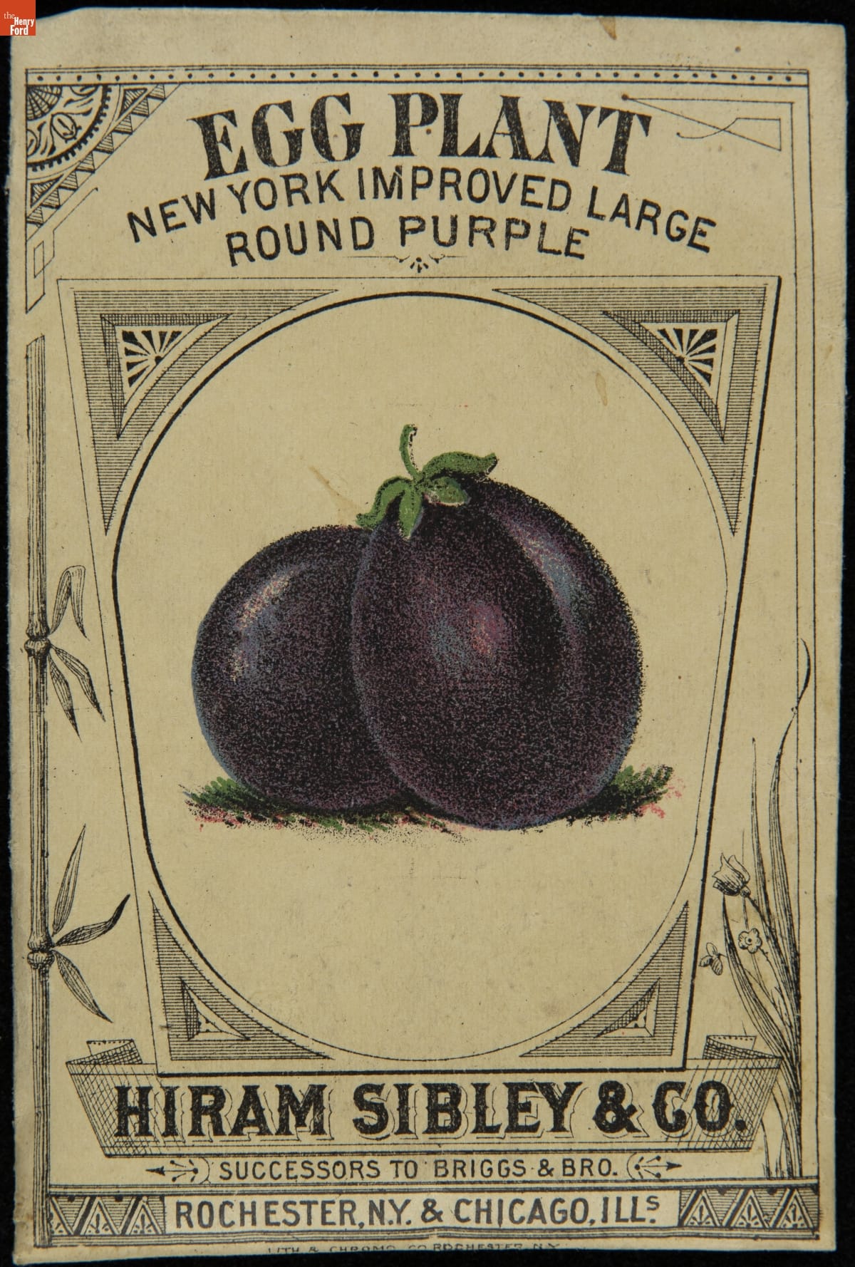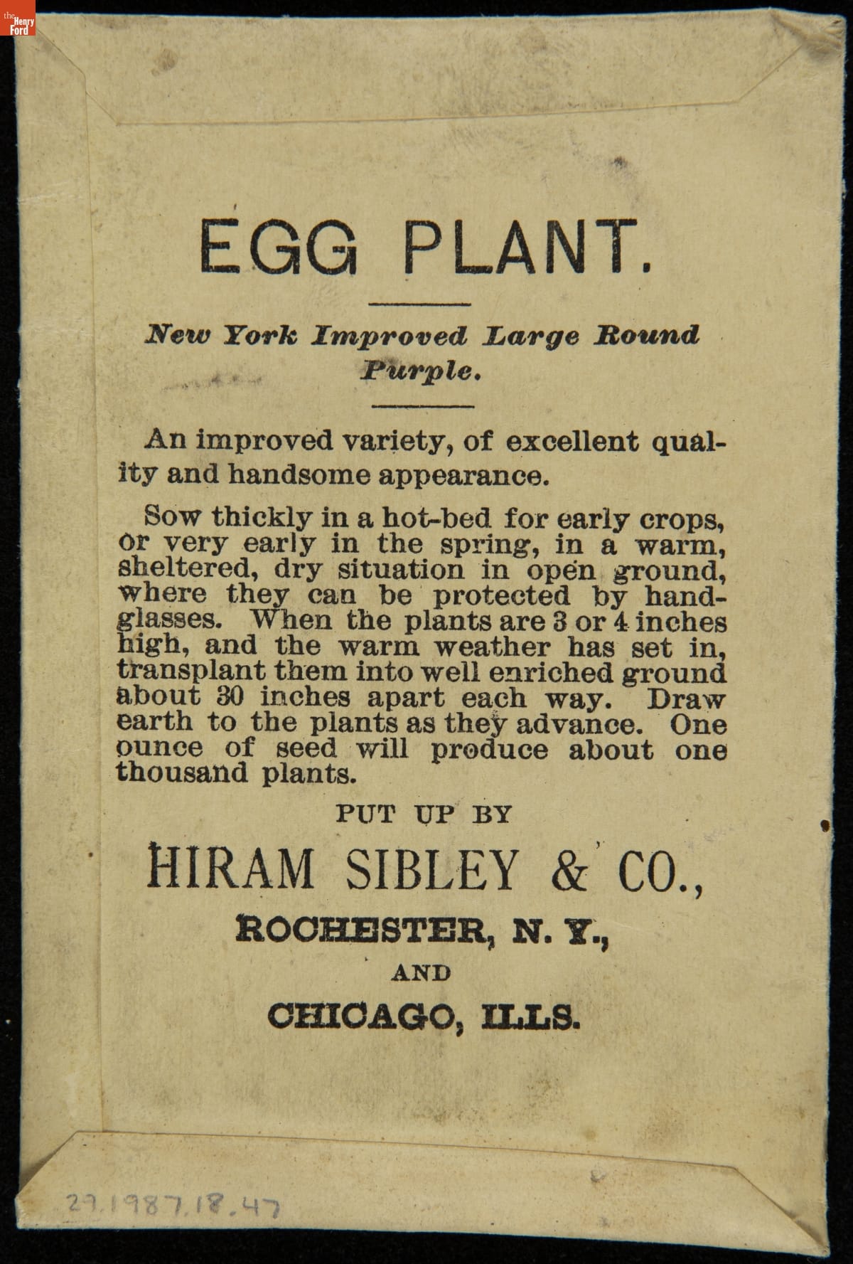 on front: EGG PLANT / NEW YORK IMPROVED LARGE / ROUND PURPLE / SEND FOR OUR ILLUSTRATED CATALOGUE... / HIRAM SIBLEY & CO. / ROCHESTER, N.Y. & CHICAGO, ILL.
