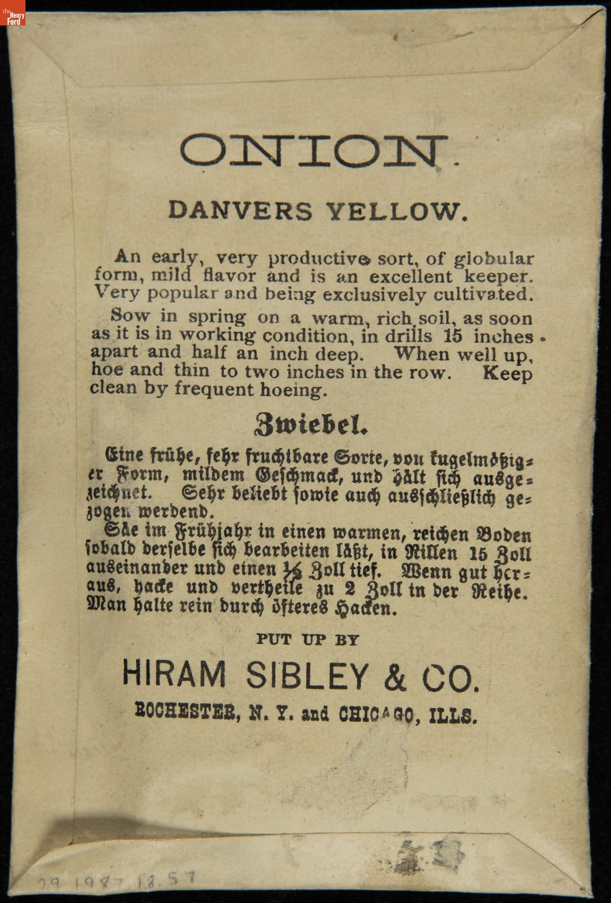 on front: ONION / DANVER'S YELLOW / SEND FOR OUR ILLUSTRATED CATALOGUE... / HIRAM SIBLEY & CO. / ROCHESTER, N.Y. & CHICAGO, ILL.