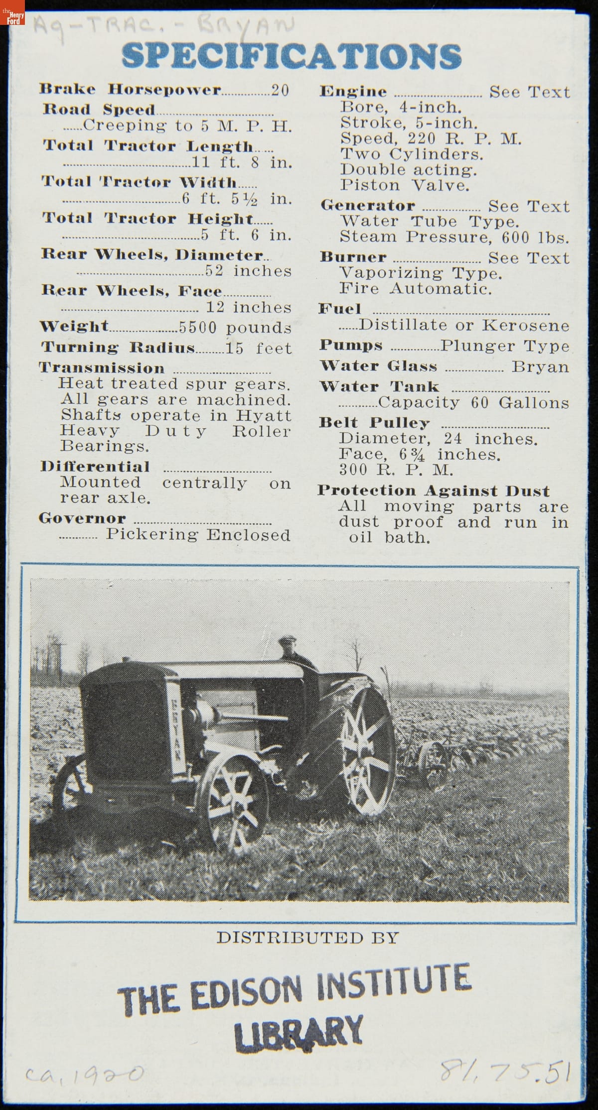 Bryan Harvester Company Catalog, "Allied Power: Bryan Light Steam Tractor! A Locomotive for Farm Work," circa 1920
