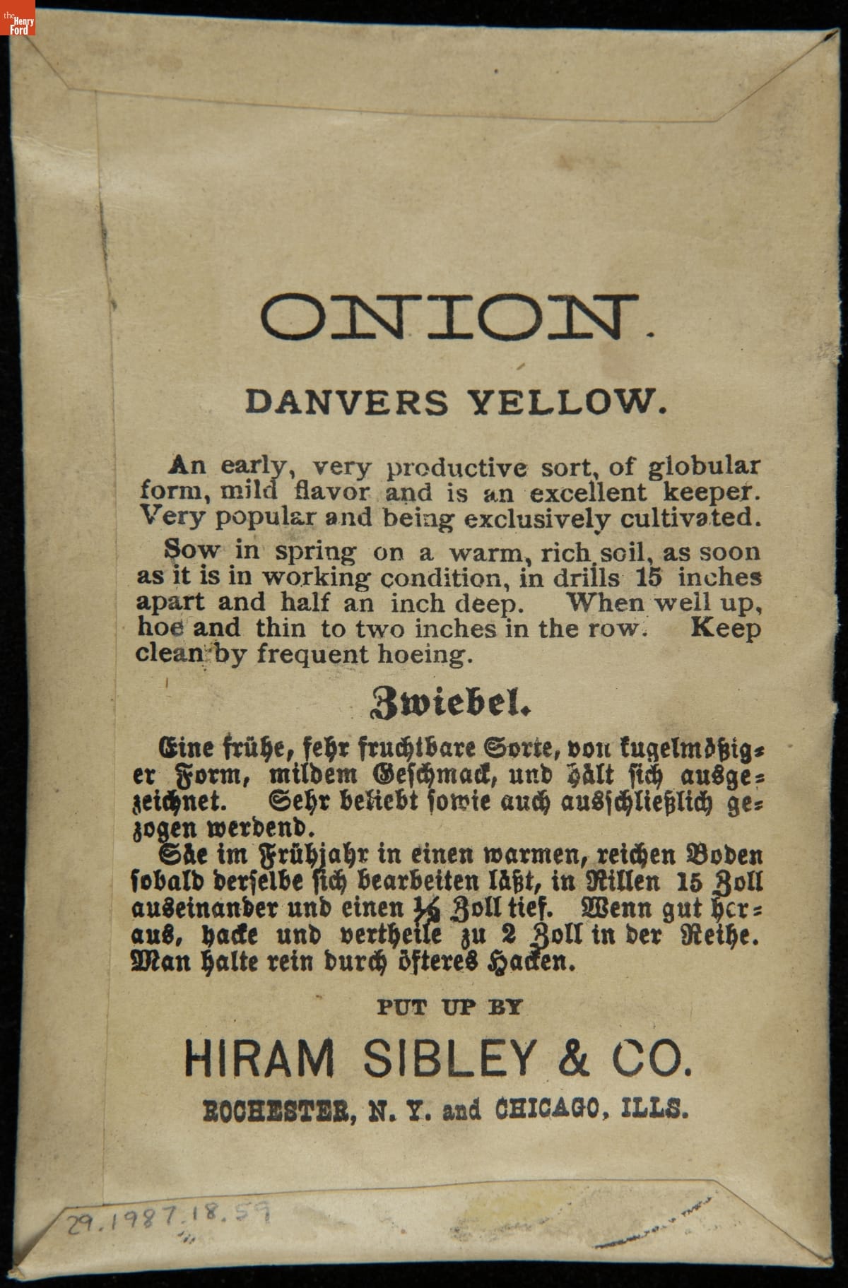 on front: ONION / DANVER'S YELLOW / SEND FOR OUR ILLUSTRATED CATALOGUE... / HIRAM SIBLEY & CO. / ROCHESTER, N.Y. & CHICAGO, ILL.