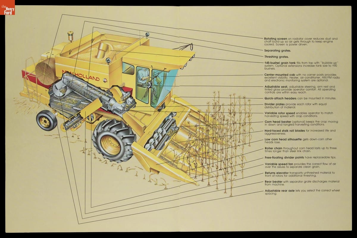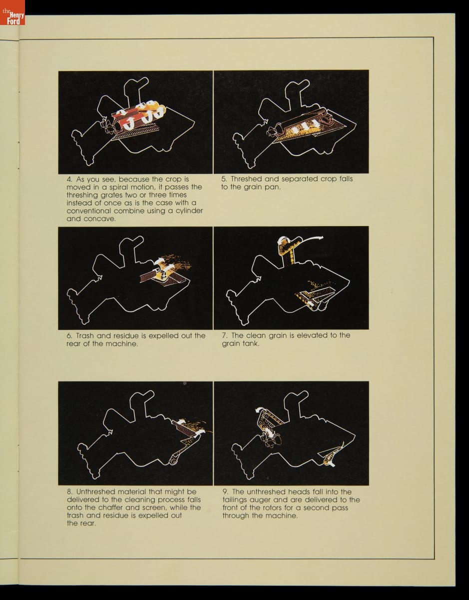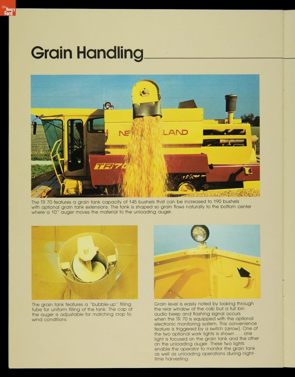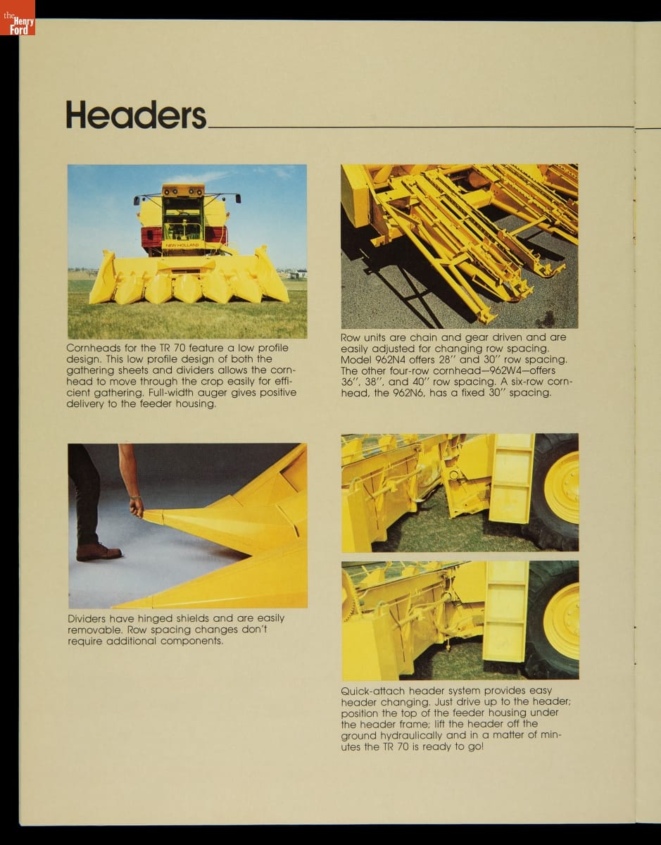 Engineers designed the TR70 as a compact machine suitable for hilly terrain. The twin rotors (TR) shelled corn or threshed grain and moved it through the combine's body. Setting the rotors at an angle (axial) shortened the machine. Farmers changed the front-end attachment to harvest corn, beans, or wheat. Photographs and diagrams in this catalog helped explain additional features.
