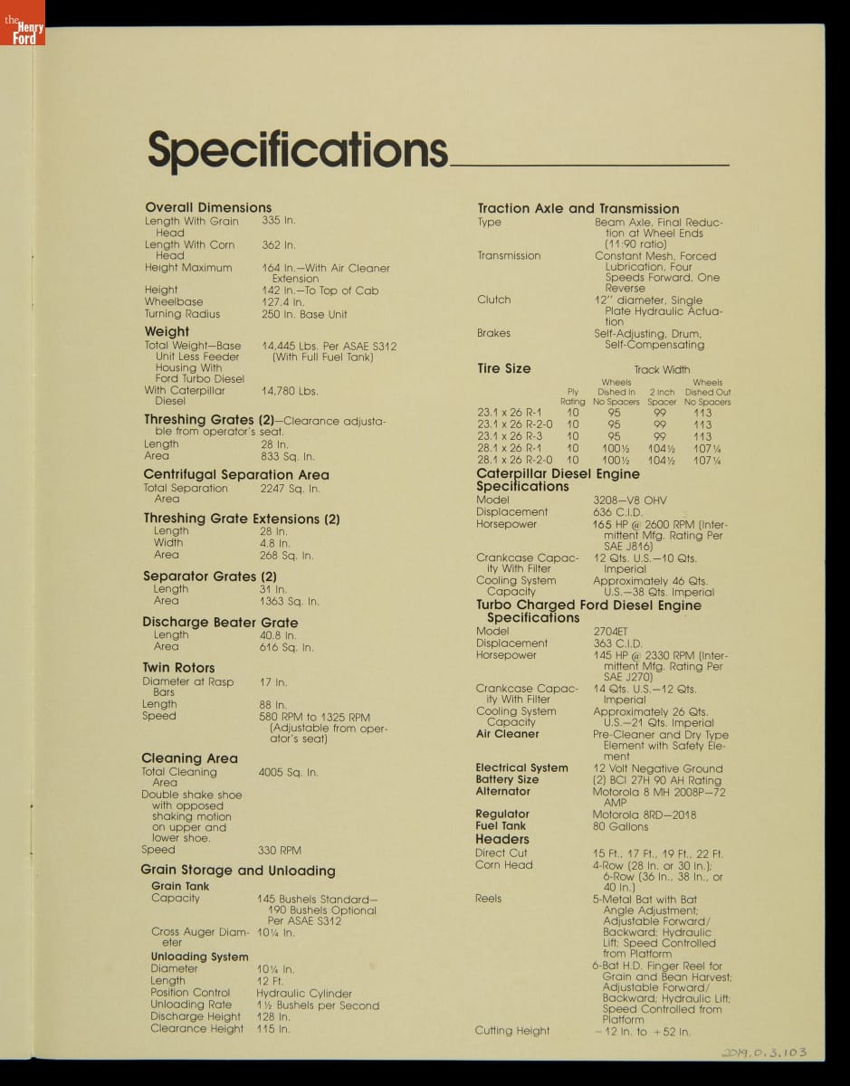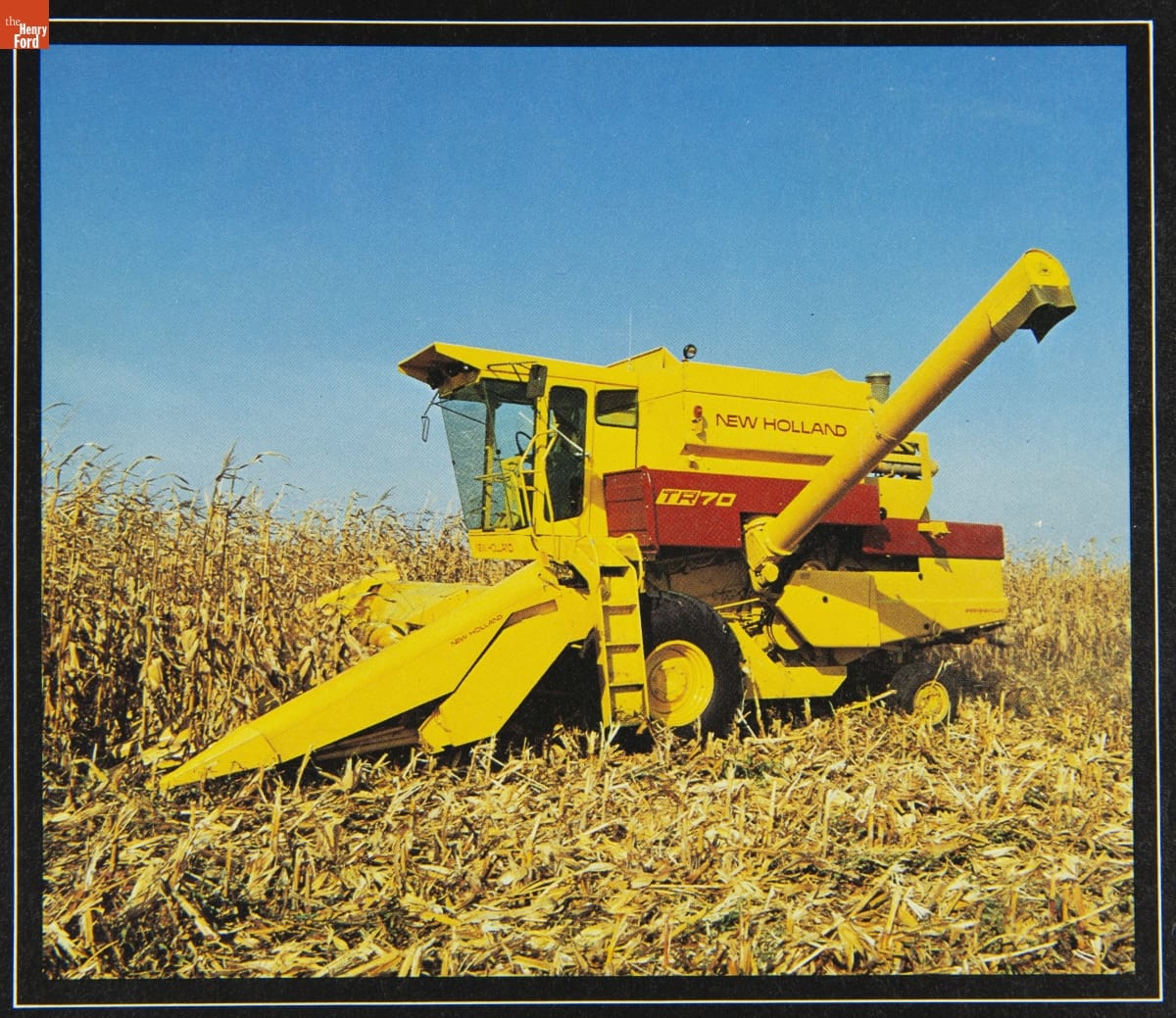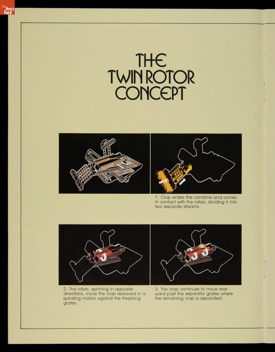 Engineers designed the TR70 as a compact machine suitable for hilly terrain. The twin rotors (TR) shelled corn or threshed grain and moved it through the combine's body. Setting the rotors at an angle (axial) shortened the machine. Farmers changed the front-end attachment to harvest corn, beans, or wheat. Photographs and diagrams in this catalog helped explain additional features.