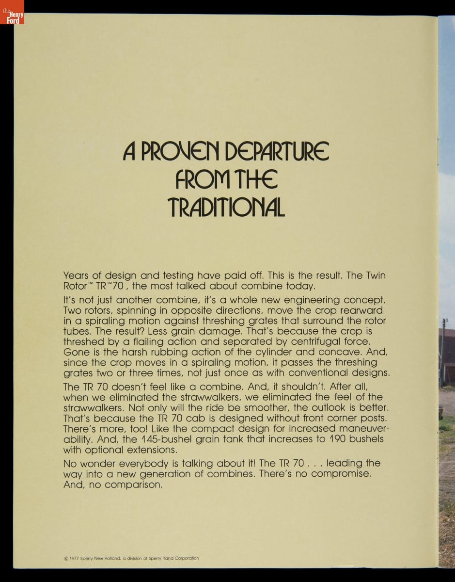 Sperry Rand Corporation - Sperry New Holland Division Catalog, "TR70 Twin Rotor Combine," 1977