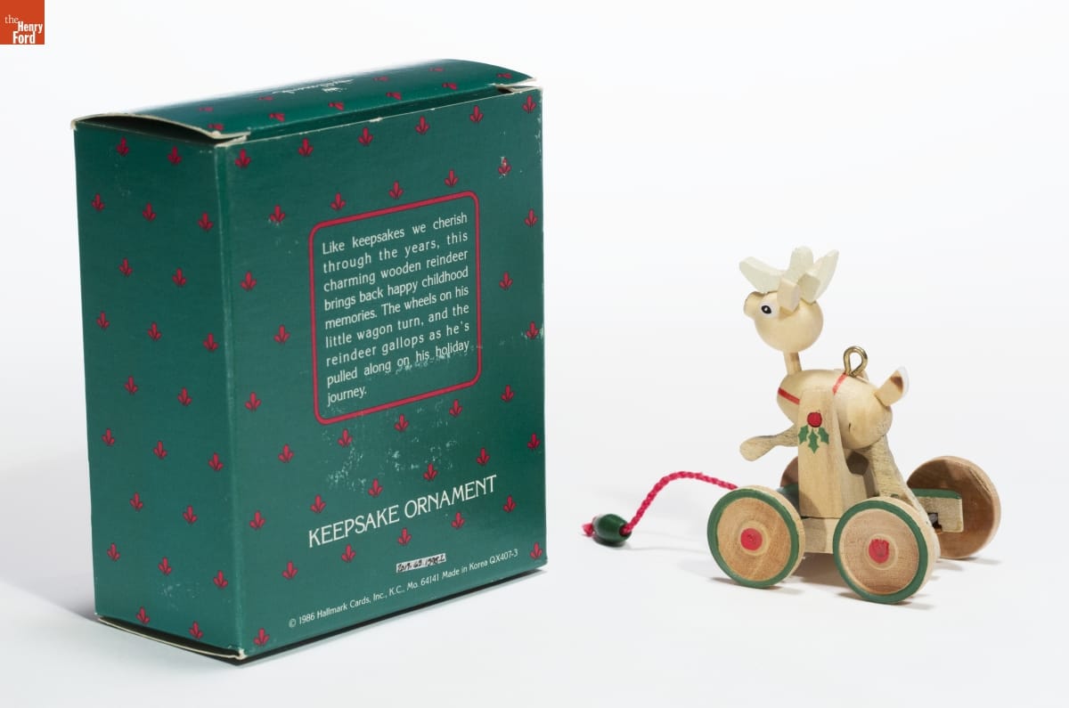 Like keepsakes we cherish / through the years, this / charming wooden reindeer / brings back happy childhood / memories. The wheels on his / little wagon turn, and the / reindeer gallops as he's / pulled along on his holiday / journey. / KEEPSAKE ORNAMENT / (C) 1986 Hallmark Cards, Inc., K.C., Mo 64141 Made in Korea QX407-3