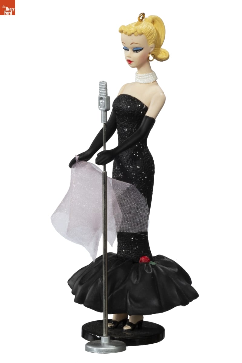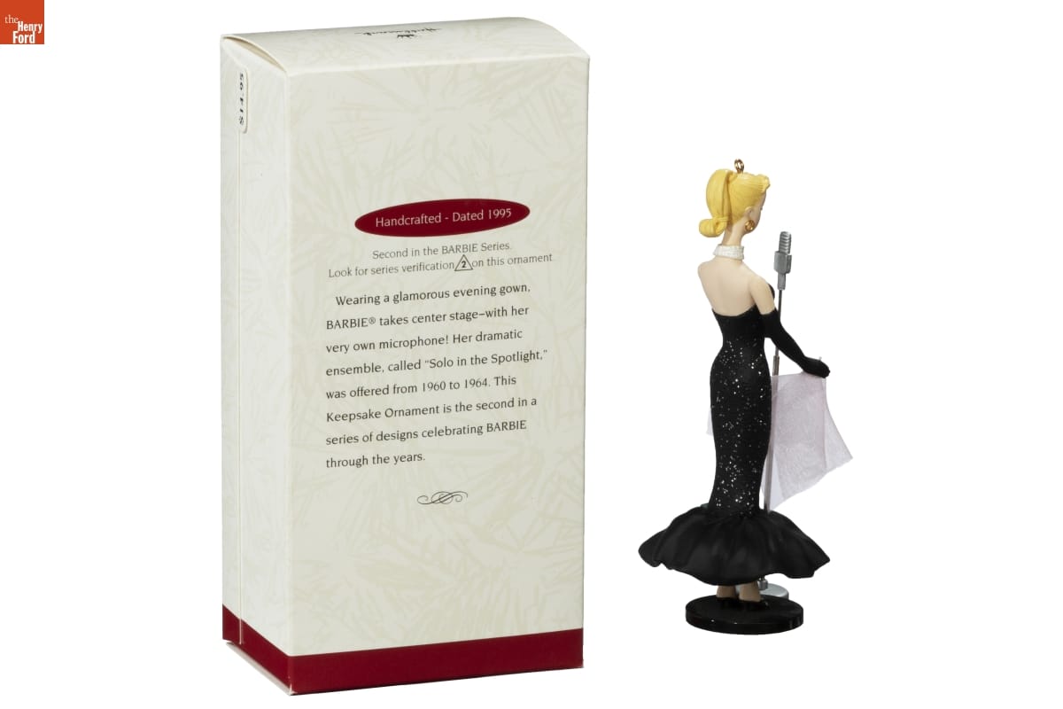 Handcrafted - Dated 1995 / Second in the BARBIE Series. / Look for series verification 2 on this ornament. / Wearing a glamorous evening gown, / BARBIE(R) takes center stage--with her / very own microphone! Her dramatic / ensemble, called "Solo in the Spotlight," / was offered from 1960 to 1964. This / Keepsake Ornament is the second in a / series of designs celebrating BARBIE / through the years.
