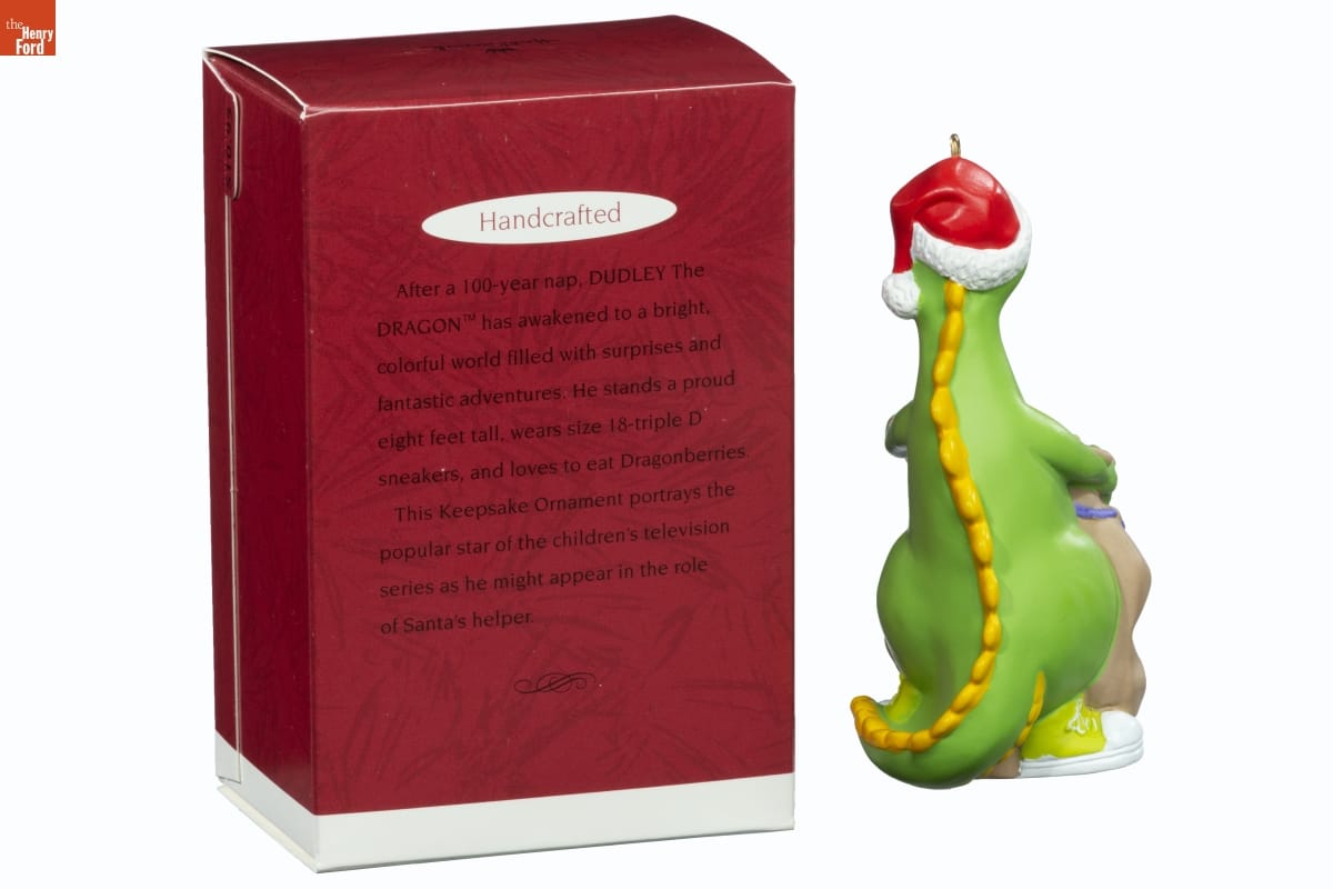 Handcrafted / After a 100-year nap, DUDLEY The / DRAGON TM has awakened to a bright, / colorful world filled with surprises and / fantastic adventures. He stands a proud / eight feet tall, wears size 18-triple D / sneakers, and loves to eat Dragonberries. / This Keepsake Ornament portrays the / popular star of the children's television / series as he might appear in the role / of Santa's helper.