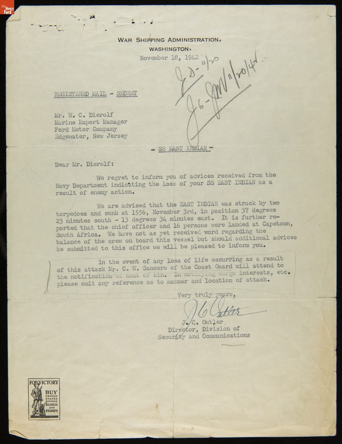 Letter regarding the Sinking of the Ford Freighter "East Indian," November 18, 1942