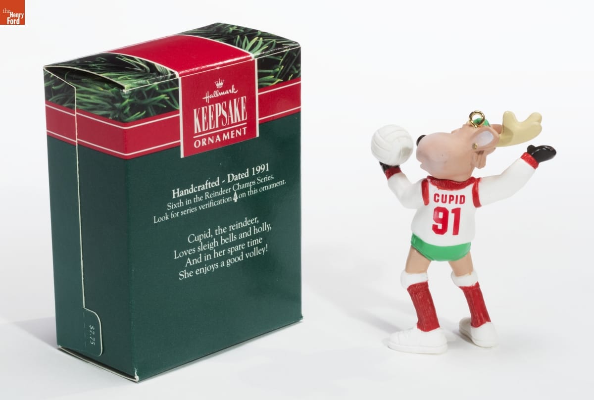 Hallmark / KEEPSAKE / ORNAMENT / Handcrafted - Dated 1991 / Sixth in the Reindeer Champs Series. / Look for series verification 6 on this ornament. / Cupid, the reindeer, / Loves sleigh bells and holly, / And in her spare time / She enjoys a good volley!