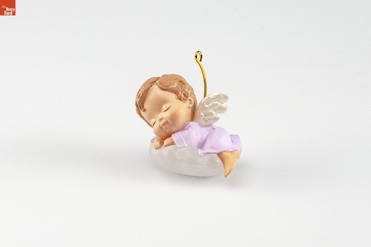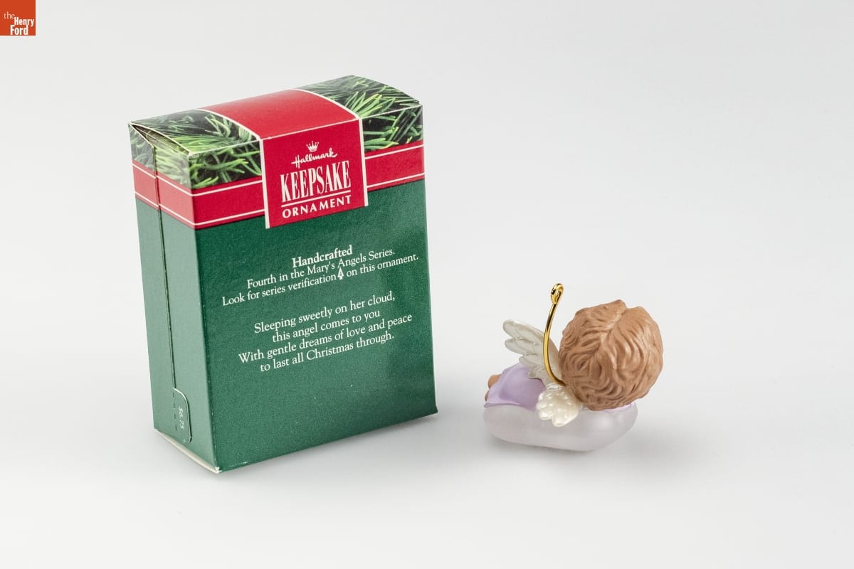 Handcrafted / Fourth in the Mary's Angels Series. / Look for series verification 4 on this ornament. / Sleeping sweetly on her cloud, / this angel comes to you / With gentle dreams of love and peace / to last all Christmas through.