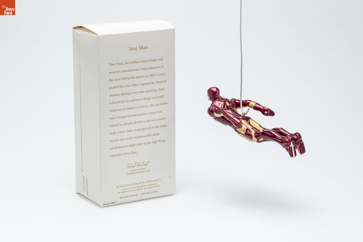 Iron Man / Tony Stark, the brilliant head of high-tech weapons manufacturer Stark Industries, is the man behind the helmet in 2008's action-packed film Iron Man. Captured by America's enemies during a war zone excursion, Stark is forced by his captors to design and build weaponry to defeat U.S forces. His patriotism and a strong survival instinct compel him instead to secretly develop a suit of powered body armor. After escaping back to the States, he uses this nearly indestructible metal exoskeleton to fight crime as the high-flying superhero Iron Man. / Robert Hurlburt / Hallmark Keepsake Artist / For decorative use only. Not for children under 8 / Concu a des fins decoratives seulement. Ne convient pas aux enfants de moins de 8 ans. / handcrafted - dated 2008