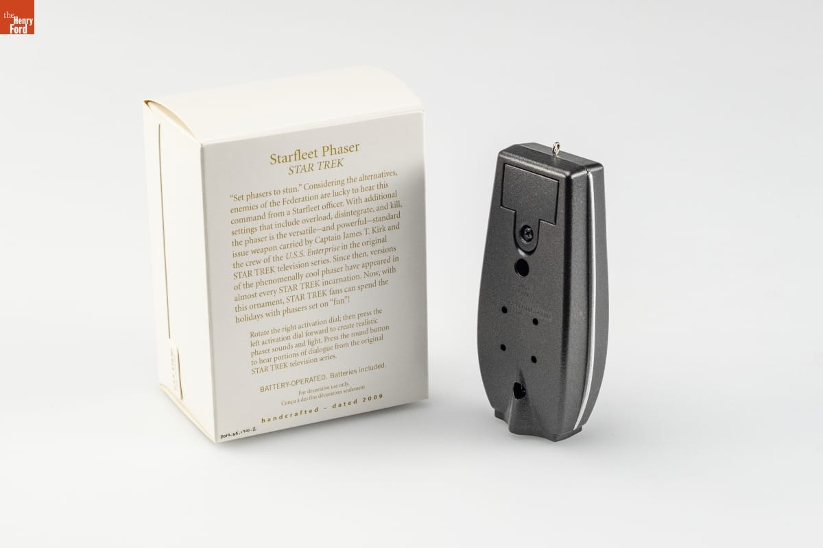 Starfleet Phaser / STAR TREK / "Set phasers to stun." Considering the alternatives, enemies of the Federation are lucky to hear this command from a Starfleet officer. With additional settings that include overload, disintegrate, and kill, the phaser is the versatile--and powerful--standard issue weapon carried by Captain James T. Kirk and the crew of the U.S.S. Enterprise in the original STAR TREK television series. Since then, versions of the phenomenally cool phaser have appeared in almost every STAR TREK incarnation. Now, with this ornament, STAR TREK fans can spend the holidays with phasers set on "fun"! / Rotate the right activation dial; then press the left activation dial forward to create realistic phaser sounds and light. Press the round button to hear portions of dialogue from the original STAR TREK television series. / BATTERY-OPERATED. Batteries included. / For decorative use only. / Concu a des fins decoratives seulement. / handcrafted - dated 2009