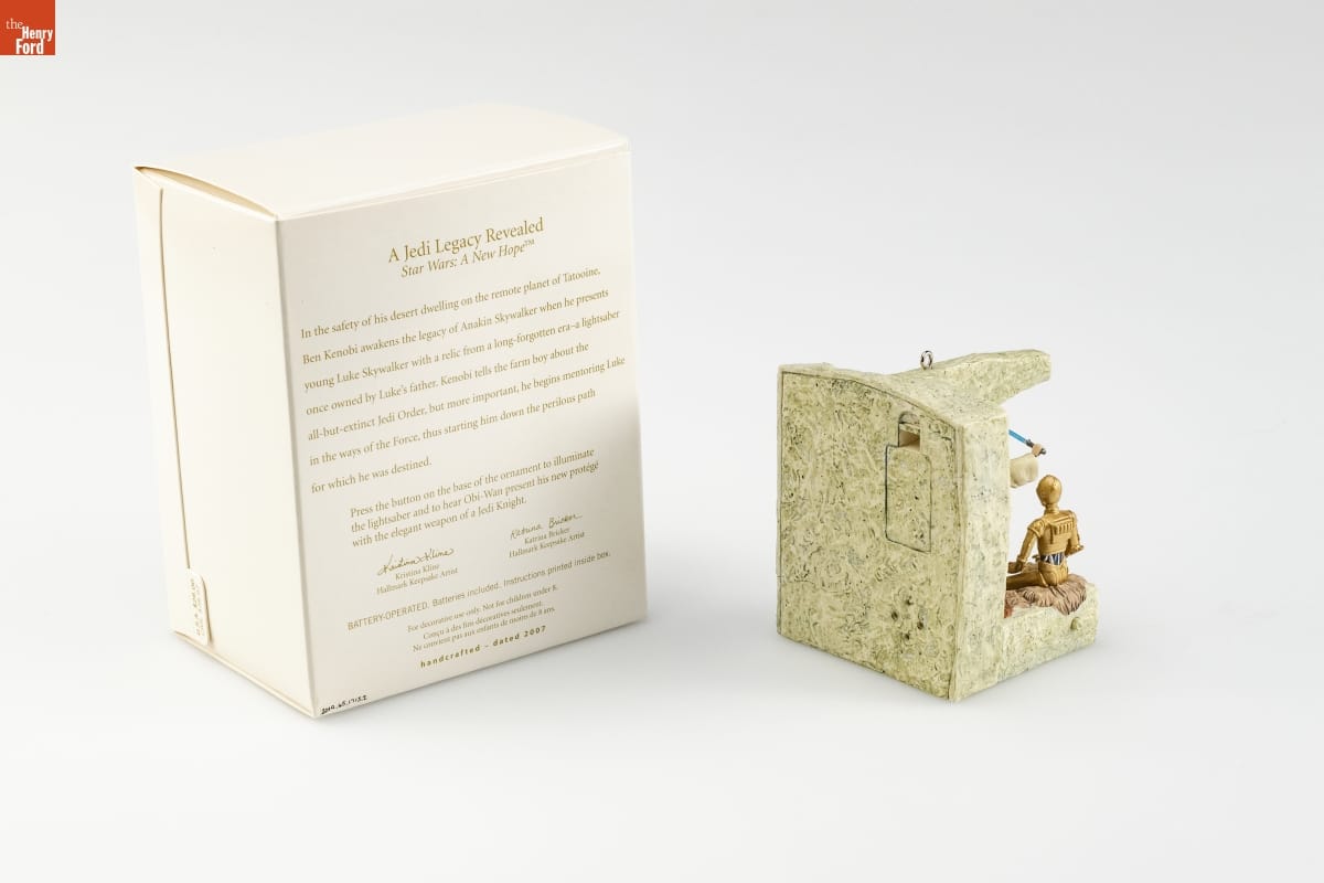 A Jedi Legacy Revealed / Star Wars: A New Hope / In the safety of his desert dwelling on the remote planet of Tatooine, Ben Kenobi awakens the legacy of Anakin Skywalker when he presents young Luke Skywalker with a relic from a long-forgotten era--a lightsaber once owned by Luke's father. Kenobi tells the farm boy about the all-but-extinct Jedi Order, but more important, he begins mentoring Luke in the ways of the Force, thus starting him down the perilous path for which he was destined. / Press the button on the base of the ornament to illuminate the lightsaber and to hear Obi-Wan present his new protege with the elegant weapon of a Jedi Knight. / Kristina Kline / Hallmark Keepsake Artist / Katrina Bricker / Hallmark Keepsake Artist / BATTERY-OPERATED. Batteries included. Instructions printed inside box. / For decorative use only. Not for children under 8 / Concu a des fins decoratives seulement. Ne convient pas aux enfants de moins de 8 ans. / handcrafted - dated 2007