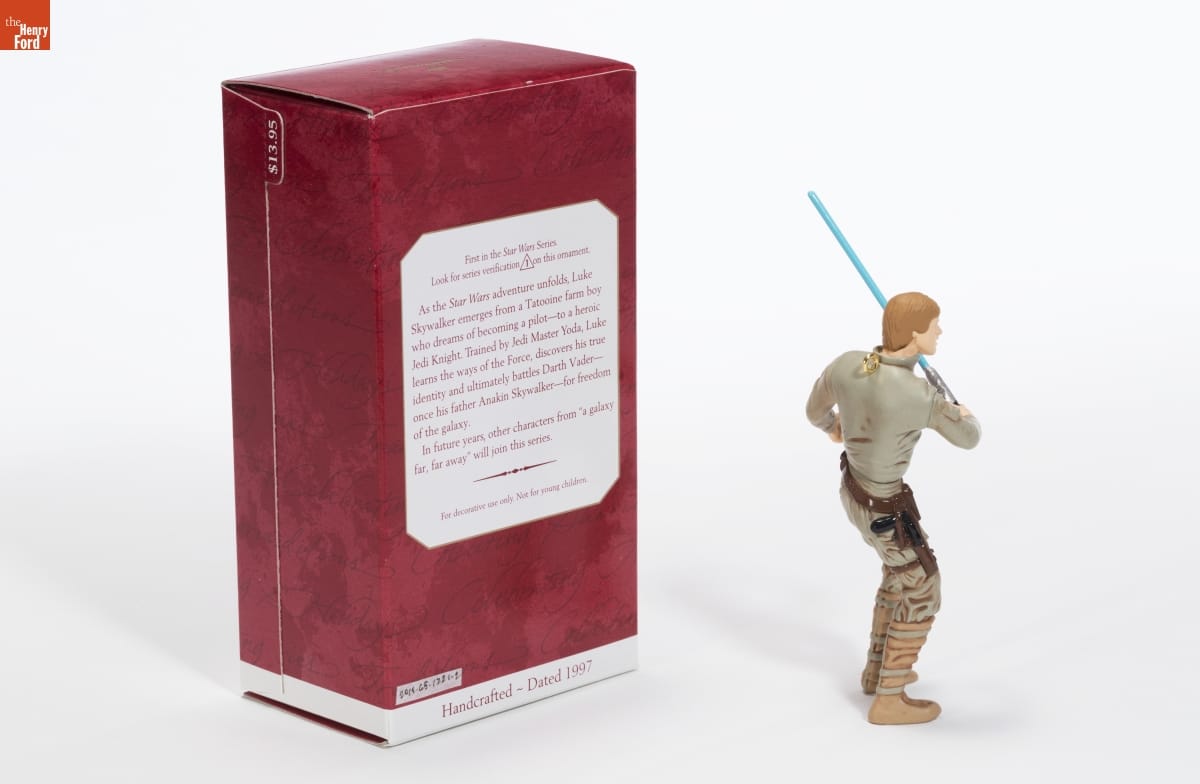 First in the Star Wars Series. / Look for series verification 1 on this ornament. / As the Star Wars adventure unfolds, Luke Skywalker emerges from a Tatooine farm boy who dreams of becoming a pilot--to a heroic Jedi Knight. Trained by Jedi Master Yoda, Luke learns the ways of the Force, discovers his true identity and ultimately battles Darth Vader--once his father Anakin Skywalker--for freedom of the galaxy. / In future years, other characters from "a galaxy far, far away" will join this series. / For decorative use only. Not for young children. / Handcrafted - Dated 1997