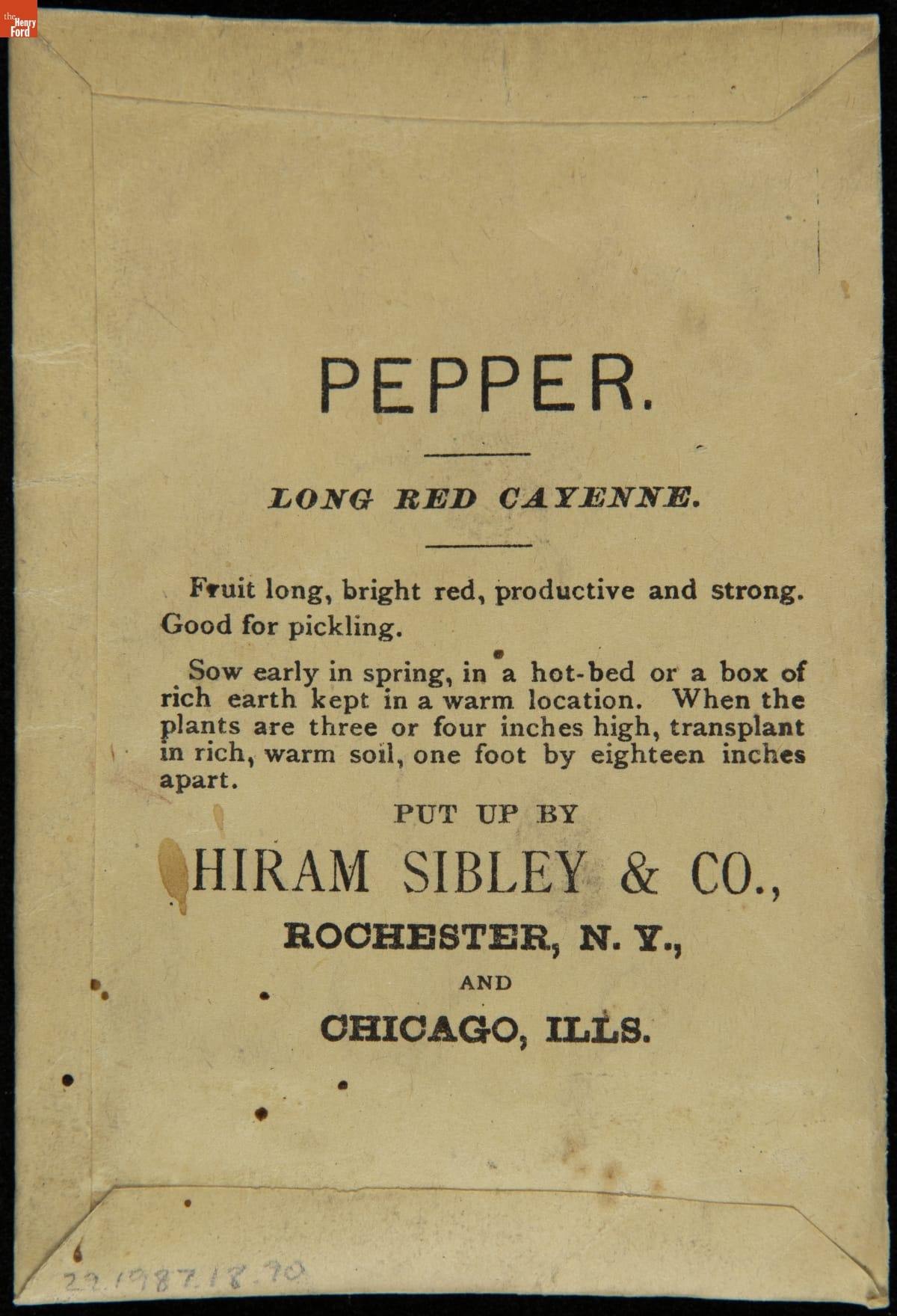 on front: PEPPER / LONG RED CAYENNE / SEND FOR OUR ILLUSTRATED CATALOGUE... / HIRAM SIBLEY & CO. / ROCHESTER, N.Y. & CHICAGO, ILL.