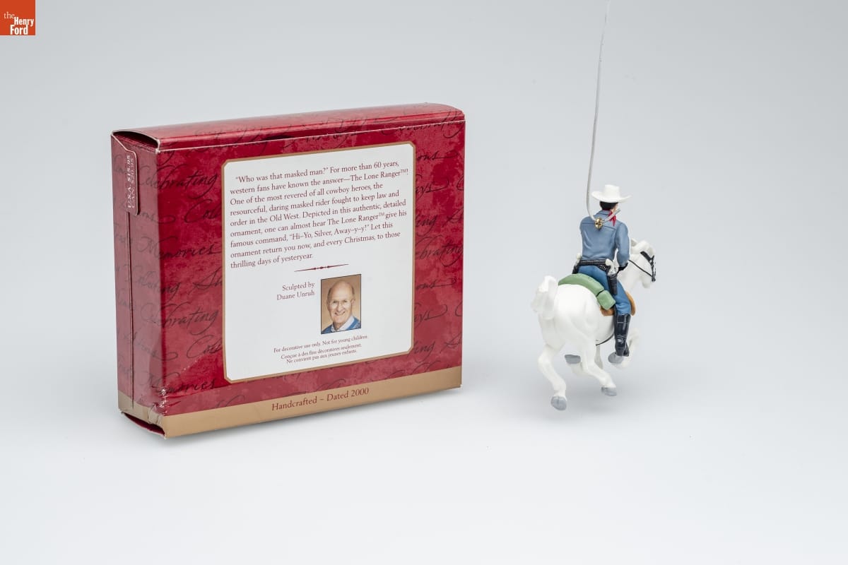 "Who was that masked man?" For more than 60 years, / western fans have known the answer-The Lone Ranger! / One of the most revered of all cowboy heroes, the / resourceful, daring masked rider fought to keep law and / order in the Old West. Depicted in this authentic, detailed / ornament, one can almost hear The Lone Ranger give his / famous command, "Hi-Yo, Silver, Away-y-y!" Let this / ornament return you now, and every Christmas, to those / thrilling days of yesteryear. / Sculpted by / Duane Unruh / For decorative use only. Not for young children. / Concue a des fins decoratives seulement. / Ne convient pas aux jeunes enfants. / Handcrafted - Dated 2000