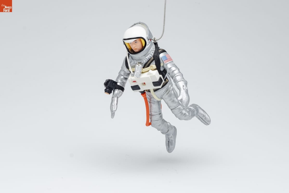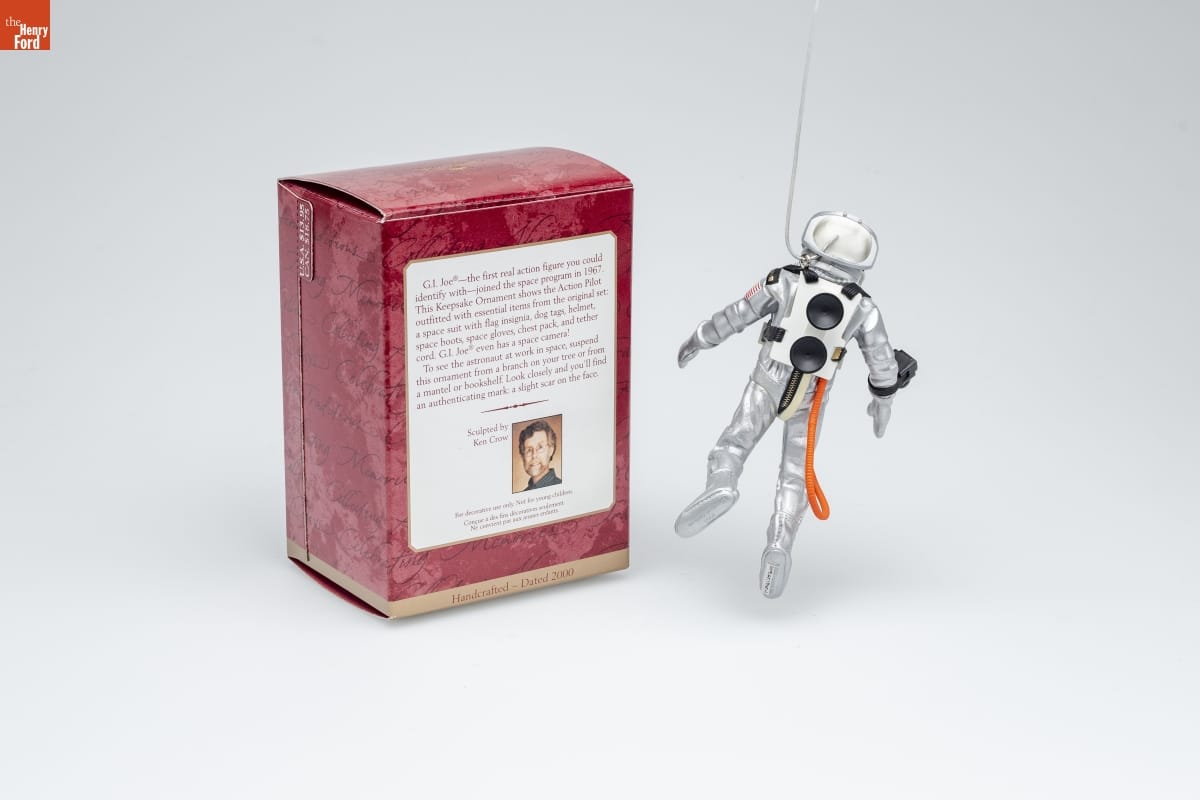 G.I. Joe-the first real action figure you could / identify with-joined the space program in 1967. / This Keepsake Ornament show the Action Pilot / outfitted with essential items from the original set: / a space suit with flag insignia, dog tags, helmet, / space boots, space gloves, chest pack, and tether / cord. G.I. Joe even has a space camera! / To see the astronaut at work in space, suspend / this ornament from a branch on your tree or from / a mantel or bookshelf. Look closely and you'll find / an authenticating mark: a slight scar on the face. / Sculpted by / Ken Crow / For decorative use only. Not for young children. / Concue a des fins decoratives seulement. / Ne convient pas aux jeunes enfants. / Handcrafted - Dated 2000