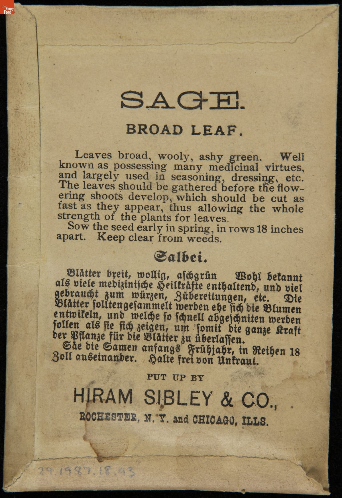 on front: SAGE / ENGLISH BROAD LEAF / SEND FOR OUR ILLUSTRATED CATALOGUE... / HIRAM SIBLEY & CO. / ROCHESTER, N.Y. & CHICAGO, ILL.