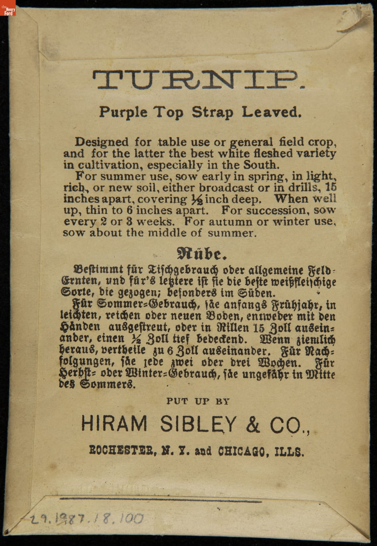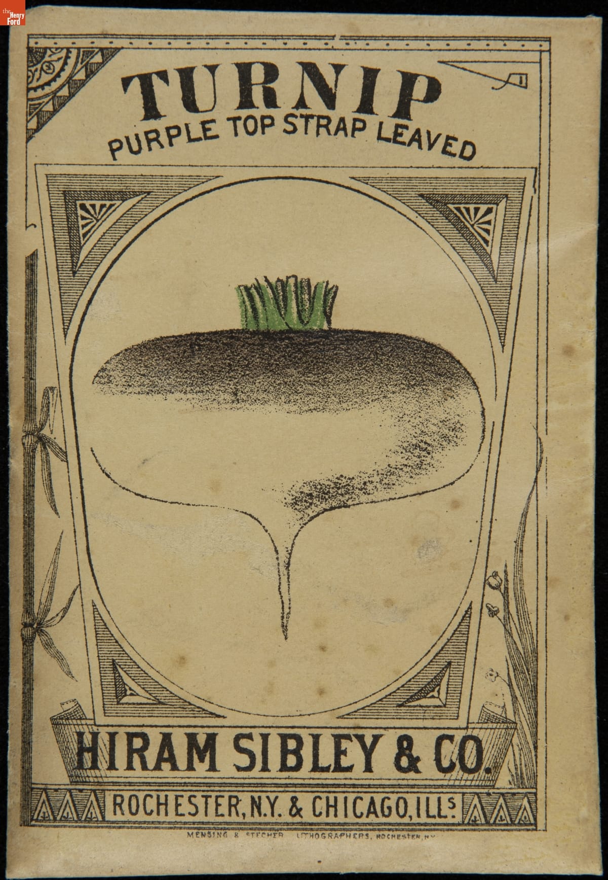 on front: TURNIP / PURPLE TOP STRAP LEAVED / SEND FOR OUR ILLUSTRATED CATALOGUE... / HIRAM SIBLEY & CO. / ROCHESTER, N.Y. & CHICAGO, ILL.