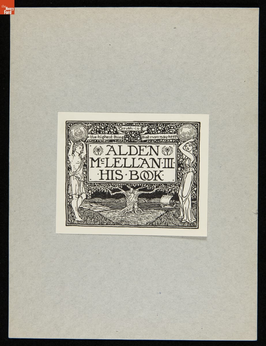 Bookplates show ownership, but they can also tell us more. Often pasted on the inside of a book's front cover or endpaper, these printed labels contain the owner's name and sometimes the words "ex-libris" (Latin for "from the library of"). Coats of arms, crests, other decorative images, poems, mottoes, and even font type provide insight into the beliefs, passions, and interests of the book's owner.