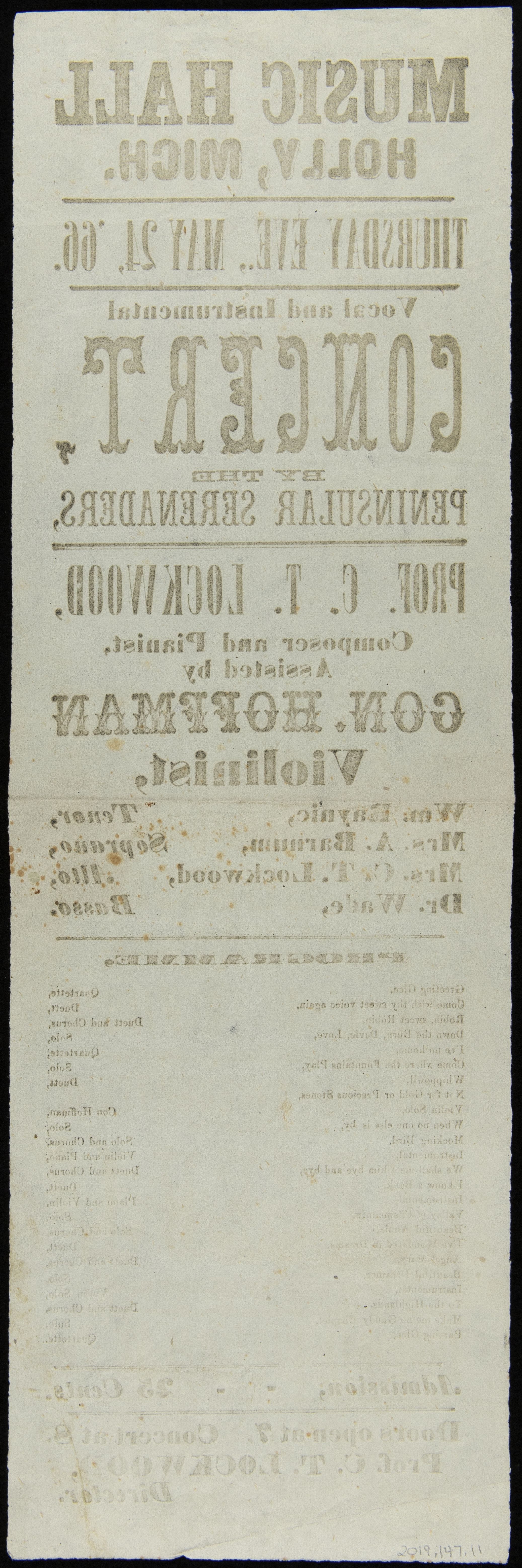 Program, "Vocal and Instrumental Concert by the Peninsular Serenaders," Music Hall, Holly, Michigan, May 24, 1866
