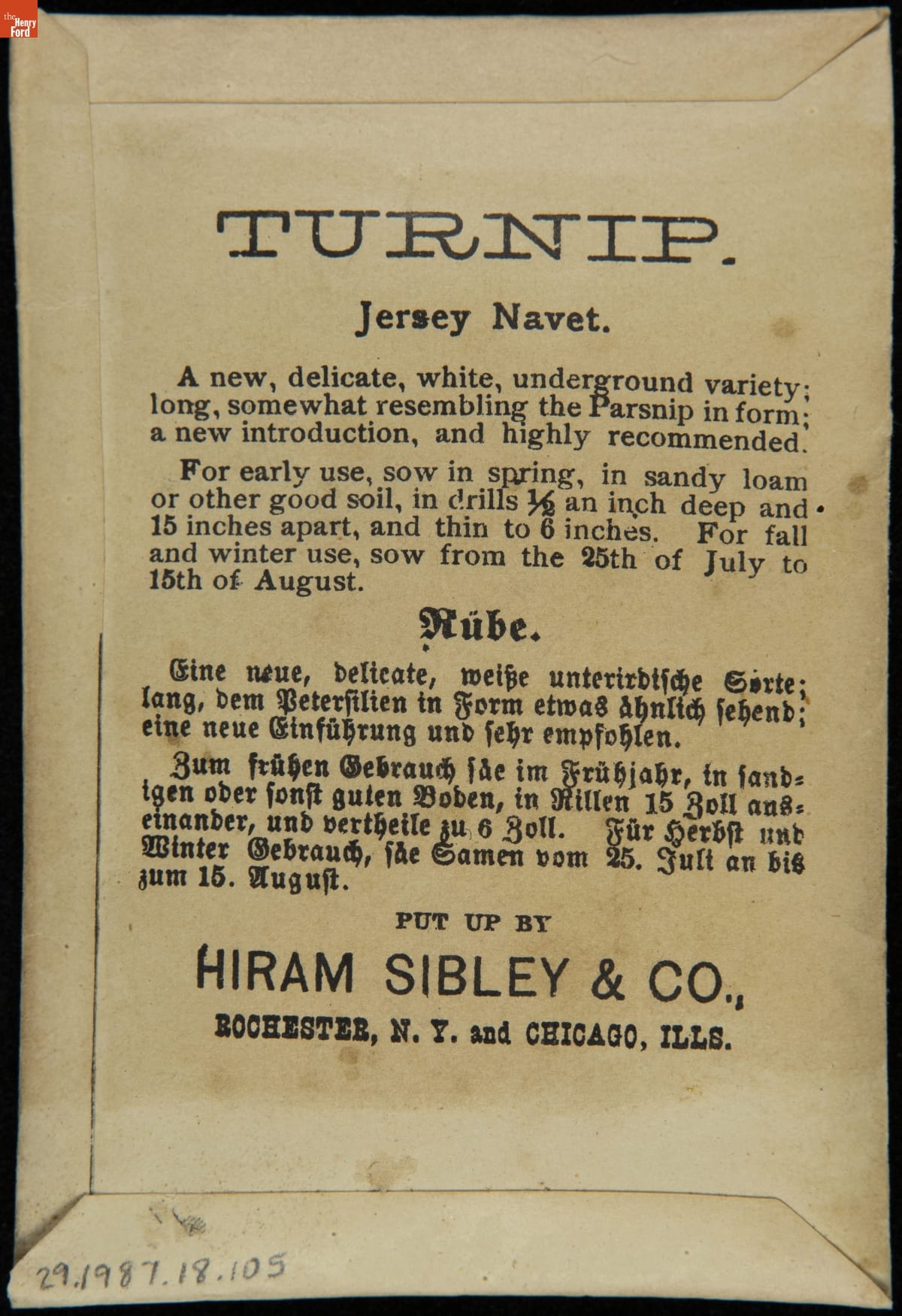 on front: TURNIP / JERSEY NAVET / SEND FOR OUR ILLUSTRATED CATALOGUE... / HIRAM SIBLEY & CO. / ROCHESTER, N.Y. & CHICAGO, ILL.
