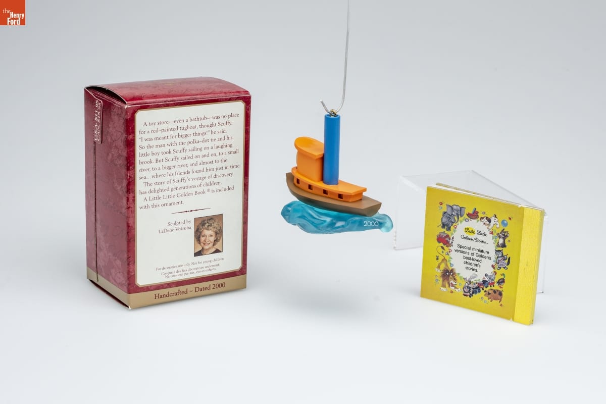 A toy store-even a bathtub-was no place / for a red-painted tugboat, thought Scuffy. / "I was meant for bigger things!" he said. / So the man with the polka-dot tie and his / little boy took Scuffy sailing on a laughing / brook. But Scuffy sailed on and on, to a small / river, to a bigger river, and almost to the / sea...where his friends found him just in time. / The story of Scuffy's voyage of discovery / has delighted generations of children. / A Little Little Golden Book is included with this ornament. / Sculpted by / LaDene Votruba / For decorative use only. Not for young children. / Concue a des fins decoratives seulement. / Ne convient pas aux jeunes enfants. / Handcrafted - Dated 2000