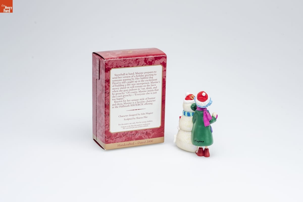 Snowball in hand, Maxine prepares to / send her version of a holiday greeting to / someone passing by. Her faithful dog / Floyd is still caught up in the excitement / of building a life-size snowperson. Maxine's / snowy stand-in will remain on the lawn / when she goes indoors to "eat, drink, and / be grouchy." Of course, Maxine insists that / she's not grouchy -- "Everyone else is just / too happy!" / Known for her unique style of humor / and dress, Maxine is a favorite character / in the Hallmark SHOEBOX offering. / Character designed by John Wagner / Sculpted by Sharon Pike / For decorative use only. Not for young children. / Concue a des fins decoratives seulement. / Ne convient pas aux jeunes enfants. / Handcrafted - Dated 2000