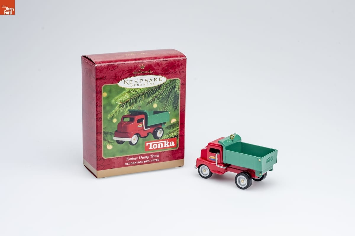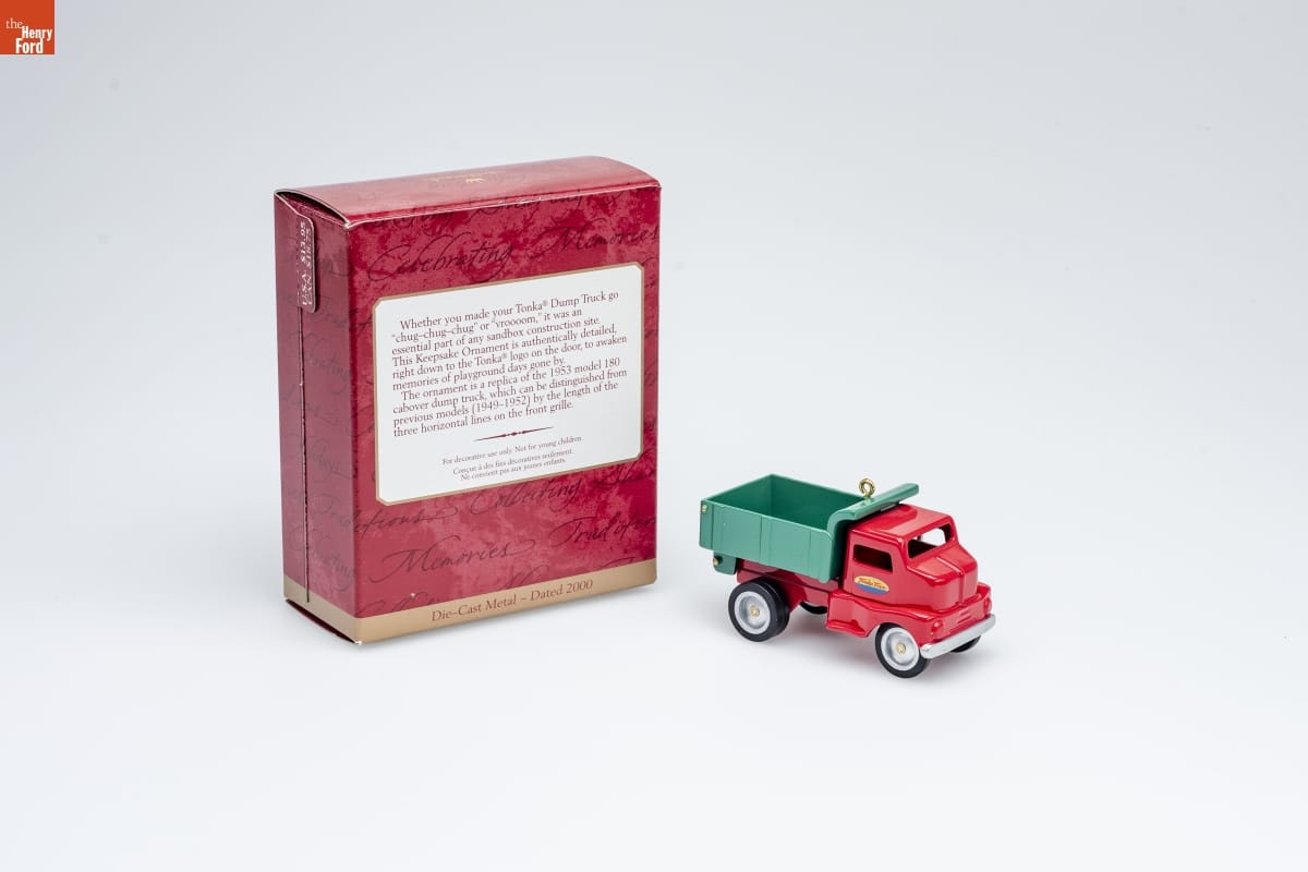 Whether you made your Tonka Dump Truck go / "chug-chug-chug" or "vroooom," it was an / essential part of any sandbox construction site. / This Keepsake Ornament is authentically detailed, / right down to the Tonka logo on the door, to awaken / memories of playground days gone by. / The ornament is a replica of the 1953 model 180 / cabover dump truck, which can be distinguished from / previous models (1949-1952) by the length of the / three horizontal lines on the front grille. / For decorative use only. Not for young children. / Concue a des fins decoratives seulement. / Ne convient pas aux jeunes enfants. / Die-Cast Metal - Dated 2000