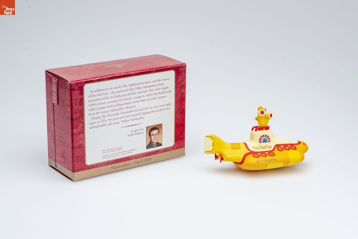 In addition to its catchy title, lighthearted lyrics, and the voices / of the Fab Four...the animated film Yellow Submarine is best / remembered for its flashy psychedelic artwork. The color-bright / 1968 cartoon recounts the fantasy voyage in which the Beatles sail / with Captain Fred to Pepperland, where they save the citizens / from the music-hating Blue Meanies. / Display this Keepsake Ornament on your tree or near your radio, / tapes, or CDs. You may just find yourself singing the words to the / unforgettable title song, "Yellow Submarine." / Sculpted by / Nello Williams / For decorative use only. Not for young children. / Concue a des fins decoratives seulement. / Ne convient pas aux jeunes enfants. / Handcrafted - Dated 2000
