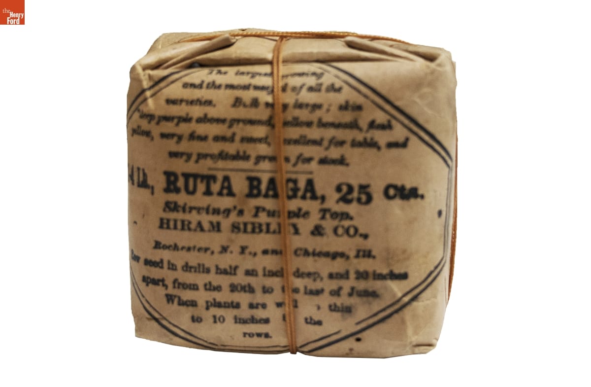 Commercial seed production and distribution depended on standardized practices. Employees at Hiram Sibley and Co. measured vegetable seeds by the quarter pound into printed and hand-tinted packages, tied them with colorful string, and packed them in specially designed boxes for shipment. Sibley marketed pre-packed collections of seeds to home gardeners and general stores owners alike during the mid-1880s.