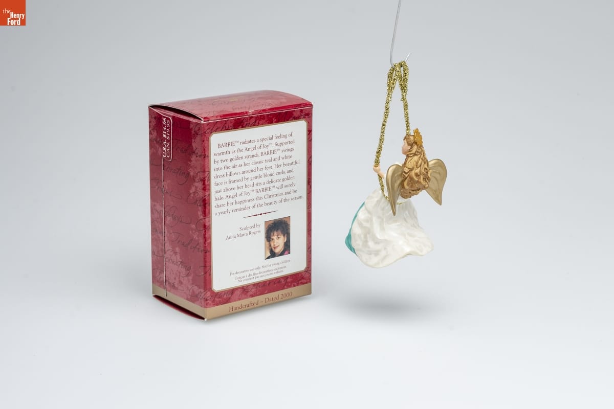 BARBIE radiates a special feeling of / warmth as the Angel of Joy. Supported / by two golden strands, BARBIE swings / into the air as her classic teal and white / dress billows around her feet. Her beautiful / face is framed by gentle blond curls, and / just above her head sits a delicate golden / halo. Angel of Joy BARBIE will surely / share her happiness this Christmas and be / a yearly reminder of the beauty of the season. / Sculpted by / Anita Marra Rogers / For decorative use only. Not for young children. / Concue a des fins decoratives seulement. / Ne convient pas aux jeunes enfants. / Handcrafted - Dated 2000