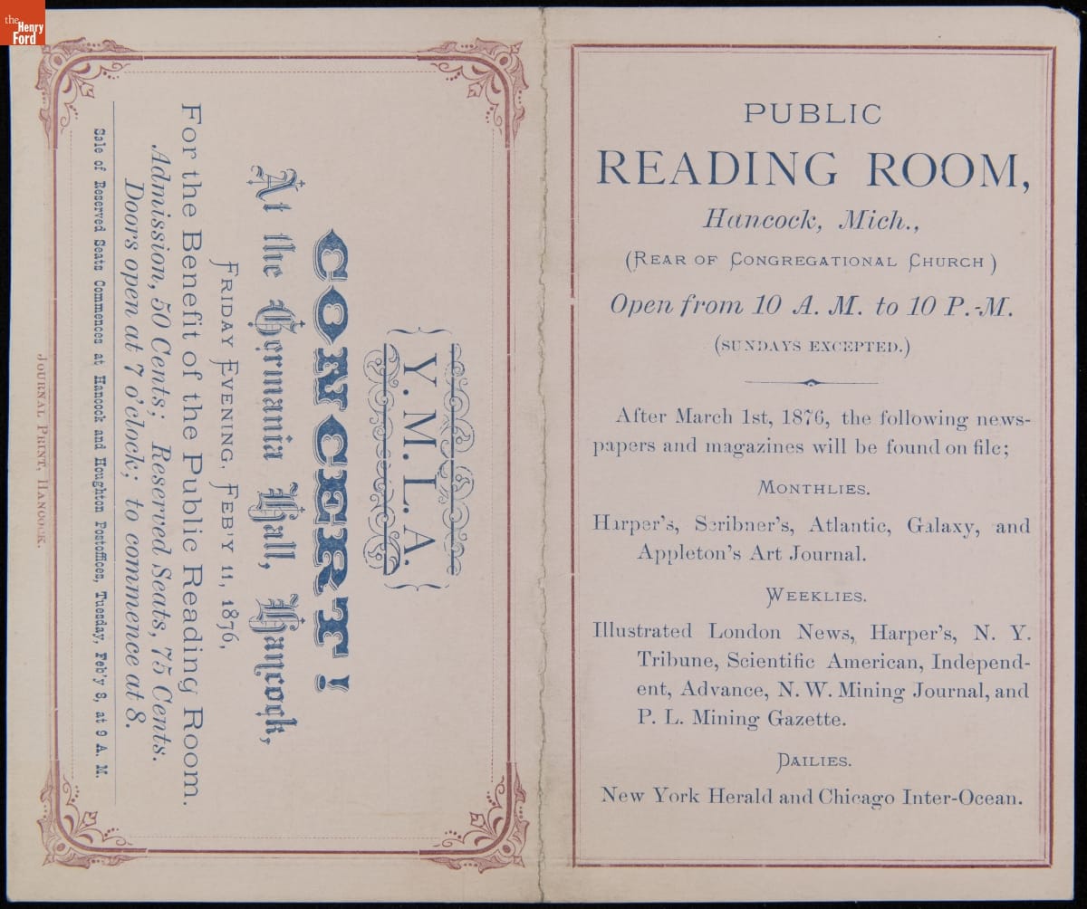 Program, "Concert! For the Benefit of the Public Reading Room," Germania Hall, Hancock, Michigan, February 11, 1876