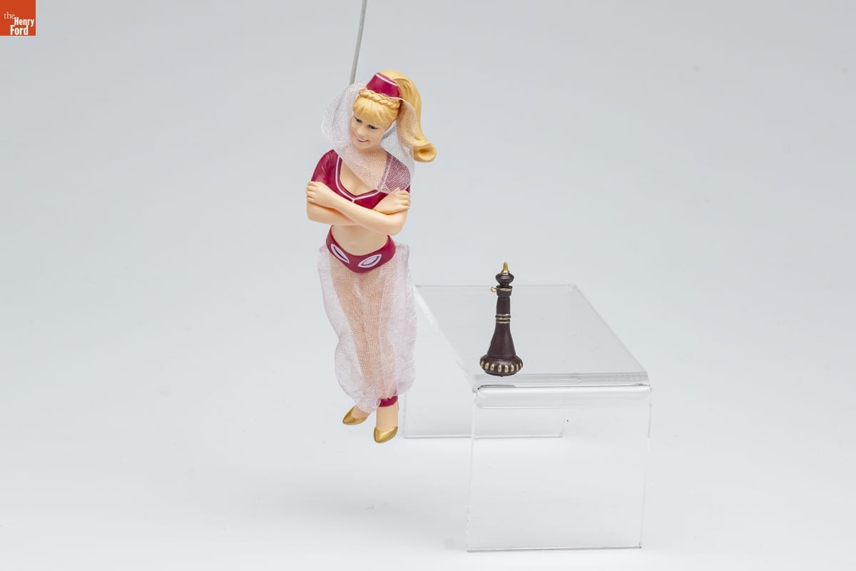 When NASA Astronaut Tony Nelson / crash-landed on a deserted island, he / was probably dreaming of being rescued. / Instead, he opened a mysterious bottle / and rescued a beautiful genie from / ancient Baghdad...and that was the beginning of the highly successful TV / sitcom I Dream of Jeannie. / Of course, Jeannie granted her Master's / wish to be rescued from the island. Then / she stayed around to "help out." / Appearing primarily to Tony and his / friend Roger Healy, she worked her magic / with a nod, a blink, and a "boink"-often / creating as many predicaments as she / solved. The original episodes ran from 1965 to 1970. A Saturday morning / cartoon version began in 1973. / Sculpted by / Patricia Andrews / For decorative use only. Not for young children. / Concue a des fins decoratives seulement. / Ne convient pas aux jeunes enfants. / Handcrafted - Dated 2000
