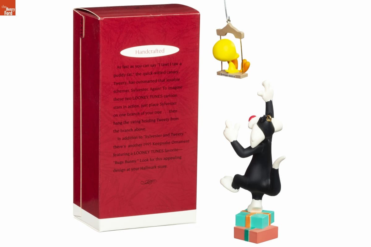 Handcrafted / As fast as you can say "I tawt I taw a / puddy tat," the quick-witted canary, / Tweety, has outsmarted that lovable / schemer, Sylvester. Again! To imagine / these two LOONEY TUNES cartoon / stars in action, just place Sylvester / on one branch of your tree...then / hang the swing holding Tweety from / the branch above. / In addition to "Sylvester and Tweety," / there's another 1995 Keepsake Ornament / featuring a LOONEY TUNES cartoon favorite-- / "Bugs Bunny." Look for this appealing / design at your Hallmark store.