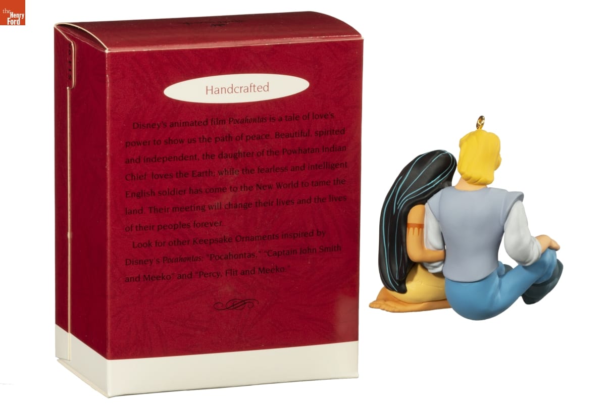 Handcrafted / Disney's animated film Pocahontas is a tale of love's / power to show us the path of peace. Beautiful, spirited / and independent, the daughter of the Powhatan Indian / Chief loves the Earth; while the fearless and intelligent / English soldier has come to the New World to tame the / land. Their meeting will change their lives and the lives / of their peoples forever. / Look for other Keepsake Ornaments inspired by / Disney's Pocahontas: "Pocahontas," "Captain John Smith / and Meeko" and "Percy, Flit and Meeko."