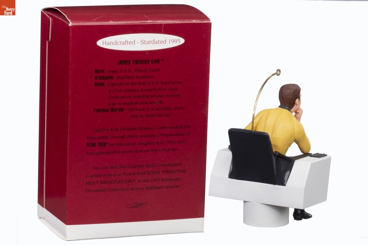 Handcrafted - Stardated 1995 / JAMES TIBERIUS KIRK TM / Born: Iowa, U.S.A., Planet Earth / Graduate: Starfleet Academy / Rank: Captain of the first U.S.S. Enterprise, / a 23rd-century, Constitution-class / Federation starship whose mission / was to explore new worlds. / Famous Words: "All I ask is a tall ship and a / star to steer her by." / Captain Kirk (William Shatner) commanded the / Enterprise through three seasons (79 episodes) of / STAR TREK(R) on television, beginning in 1966, and / has appeared in seven feature films thus far. / You can also find Captain Kirk's counterpart, / Captain Jean-Luc Picard from STAR TREK: THE / NEXT GENERATION(R) in the 1995 Keepsake / Ornament Collection at your Hallmark retailer.