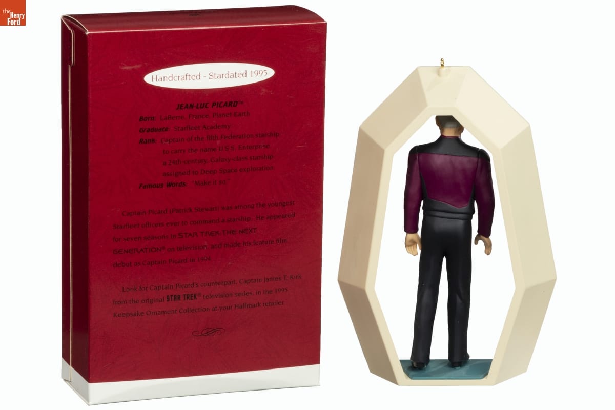 Handcrafted - Stardated 1995 / JEAN-LUC PICARD TM / Born: LaBerre, France, Planet Earth / Graduate: Starfleet Academy / Rank: Captain of the fifth Federation starship / to carry the name U.S.S. Enterprise, / a 24th-century, Galaxy-class starship / assigned to Deep Space exploration. / Famous Words: "Make it so." / Captain Picard (Patrick Stewart) was among the youngest / Starfleet officers ever to command a starship. He appeared / for seven seasons in STAR TREK: THE NEXT / GENERATION(R) on television, and made his feature film / debut as Captain Picard in 1994. / Look for Captain Picard's counterpart, Captain James T. Kirk / from the original STAR TREK(R) television series in the 1995 / Keepsake Ornament Collection at your Hallmark retailer.