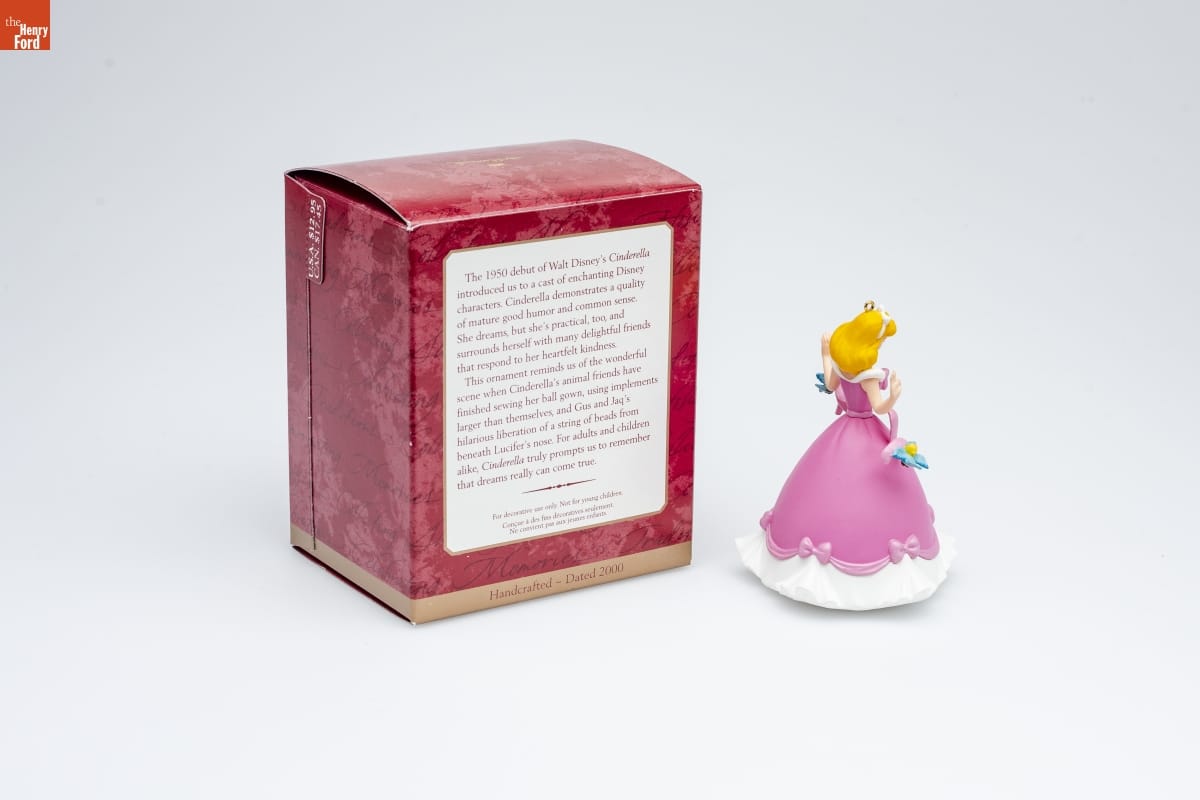 The 1950 debut of Walt Disney's Cinderella / introduced us to a cast of enchanting Disney / characters. Cinderella demonstrates a quality / of mature good humor and common sense. / She dreams, but she's practical, too, and / surrounds herself with many delightful friends / that respond to her heartfelt kindness. / This ornament reminds us of the wonderful / scene when Cinderella's animal friends have / finished sewing her ball gown, using implements / larger than themselves, and Gus and Jaq's / hilarious liberation of a string of beads from / beneath Lucifer's nose. For adults and children / alike, Cinderella truly prompts us to remember/ that dreams really can come true. / For decorative use only. Not for young children. / Concue a des fins decoratives seulement. / Ne convient pas aux jeunes enfants. / Handcrafted - Dated 2000